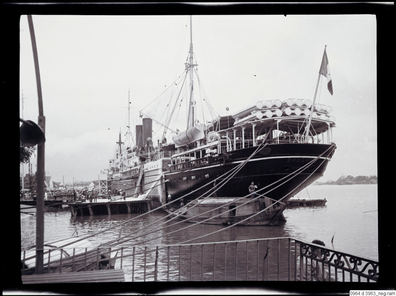 SS Amazone med hemmahamn Marseille, oceanångare vid brygga och folksamling.