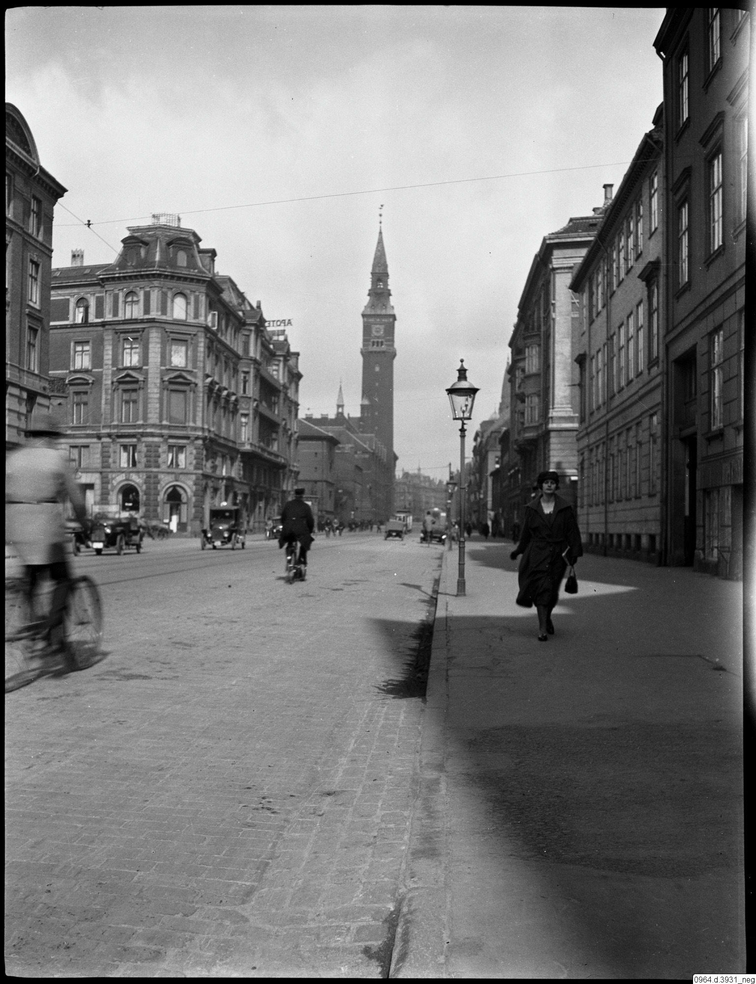 Köpenhamns rådhus med klocktorn. Från Vestre Voldgade och spårvagnsräls.