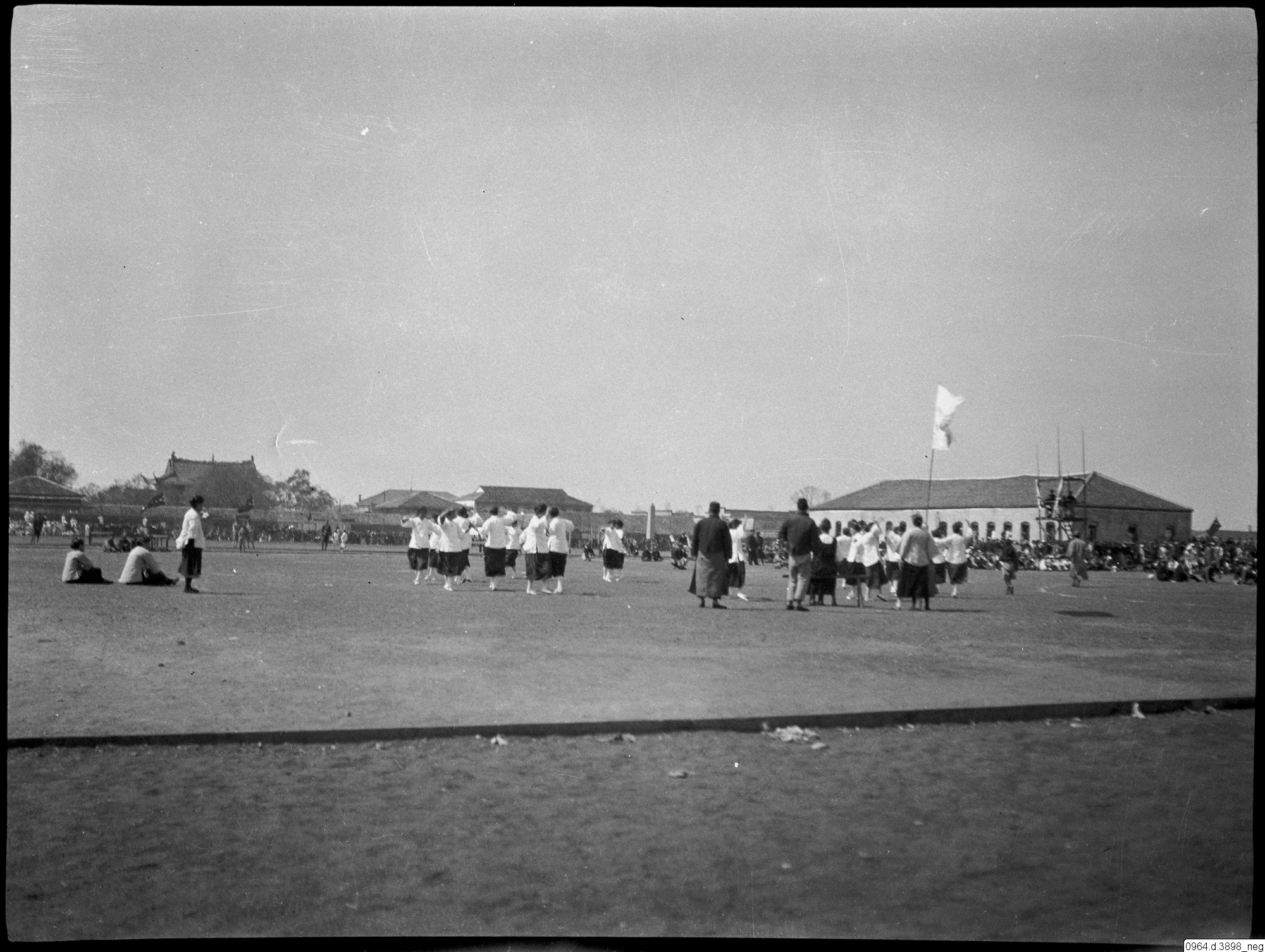 Folksamling och olika aktiviteter. Flickor i uniform som dansar.