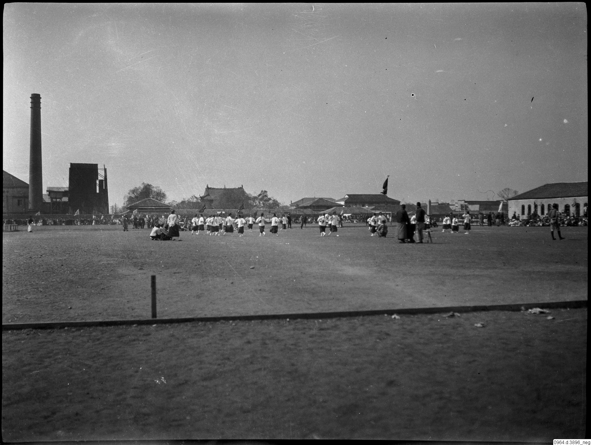 Folksamling och olika aktiviteter. Flickor i uniform som dansar.