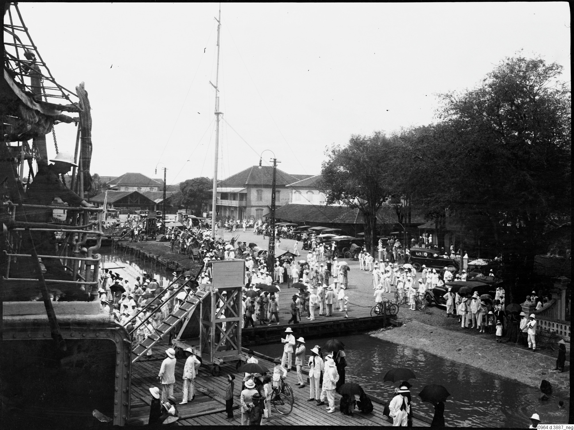 kaj, båt, tropikhattar, folksamling, bilar, pir, fotografi, photograph