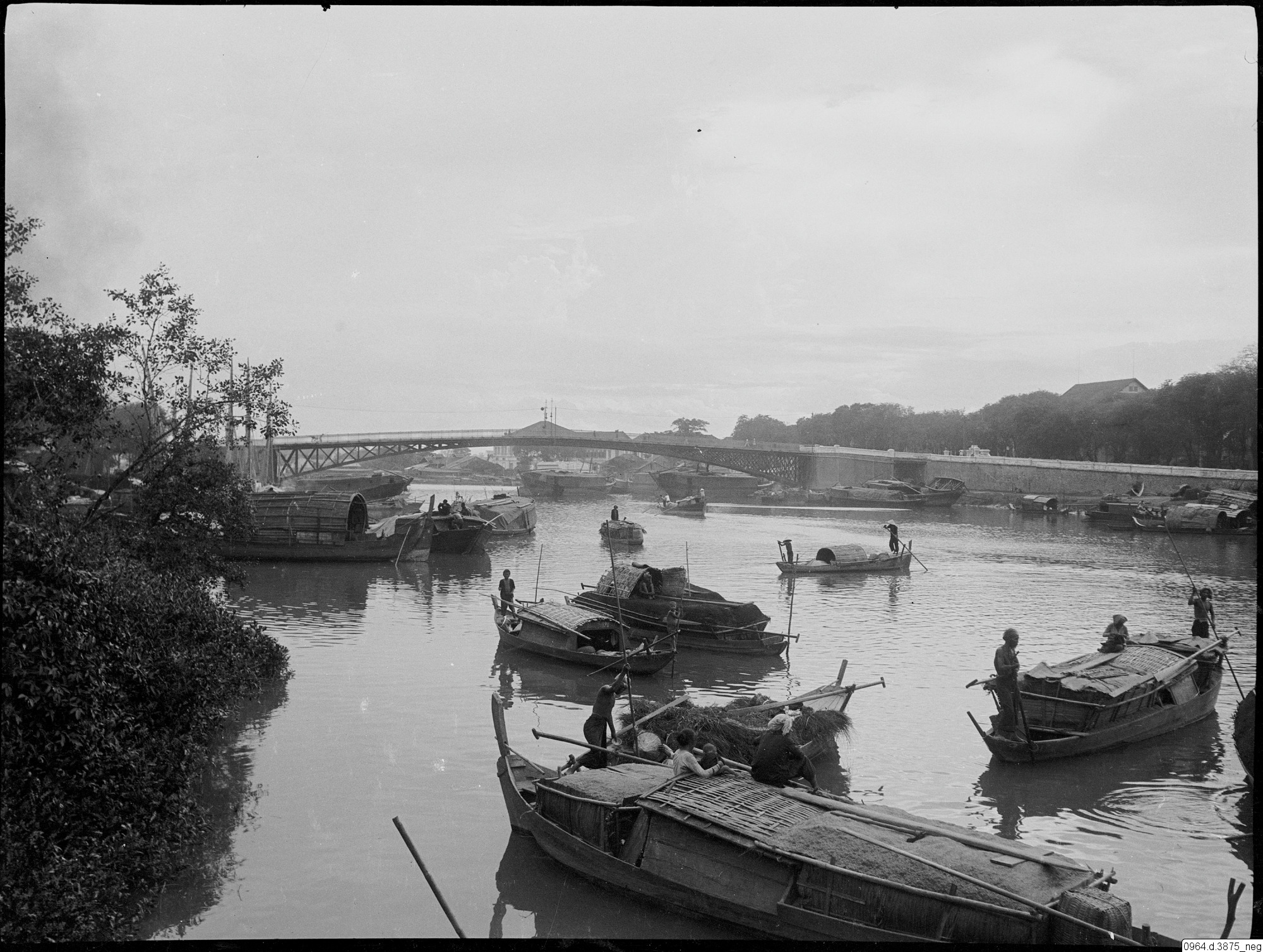 Båtar med människor på flod. Bro och byggnader i bakgrunden.