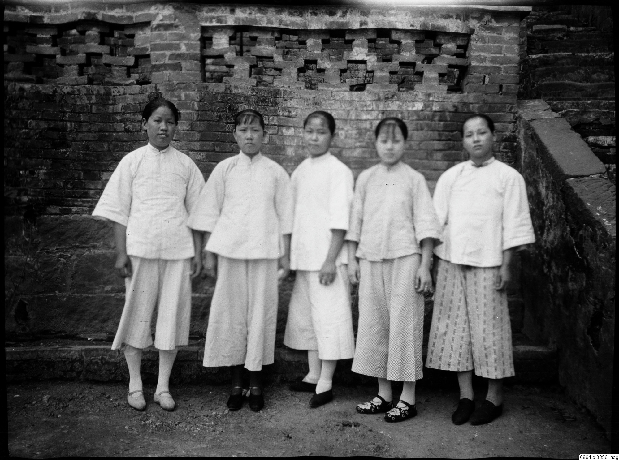 kvinnor, tegelvägg, gruppbild, flickor, skola, byggnad, fotografi, photograph