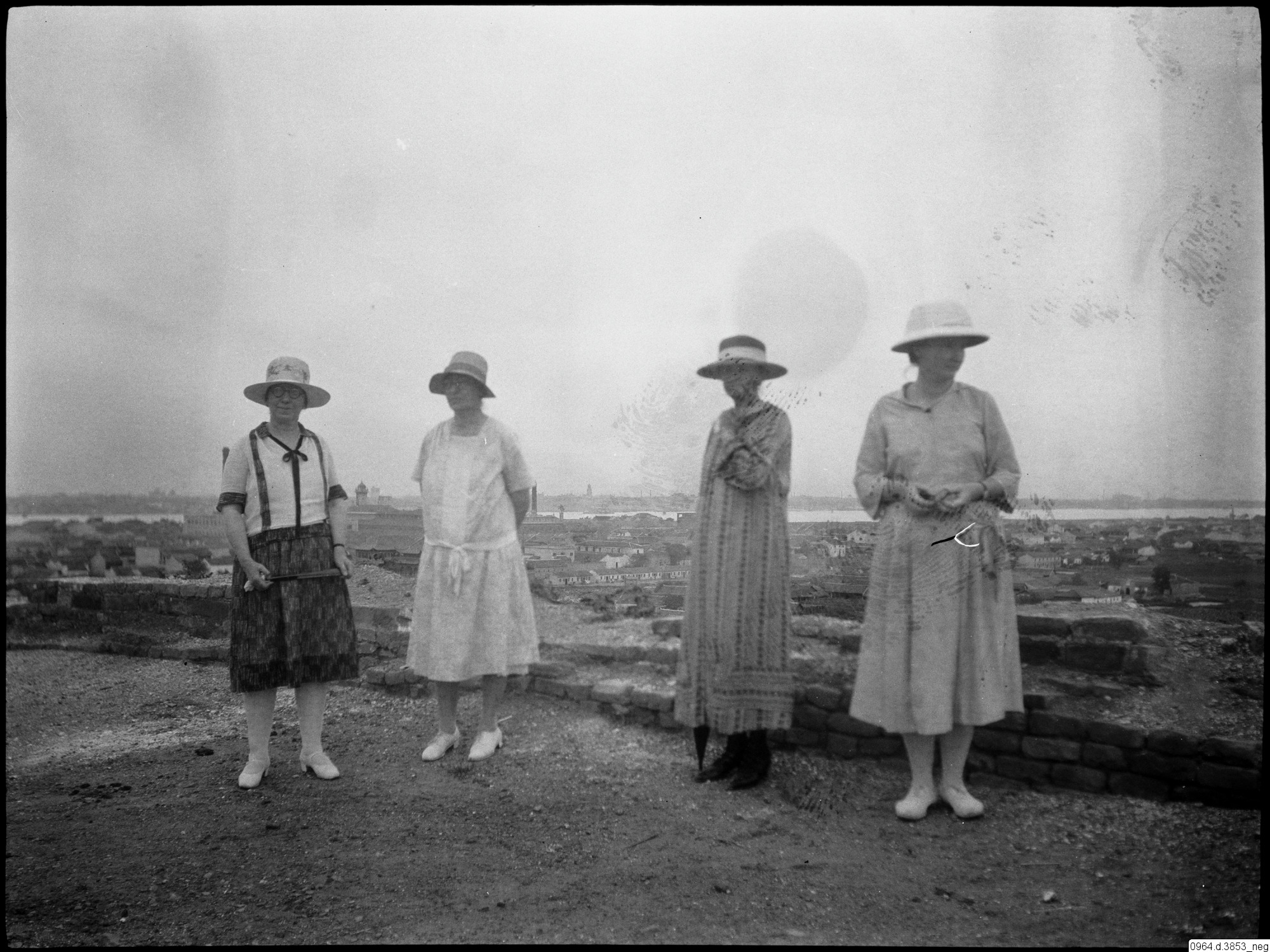 Kvinnliga missionärer med bebyggelse och flod i bakgrunden.
