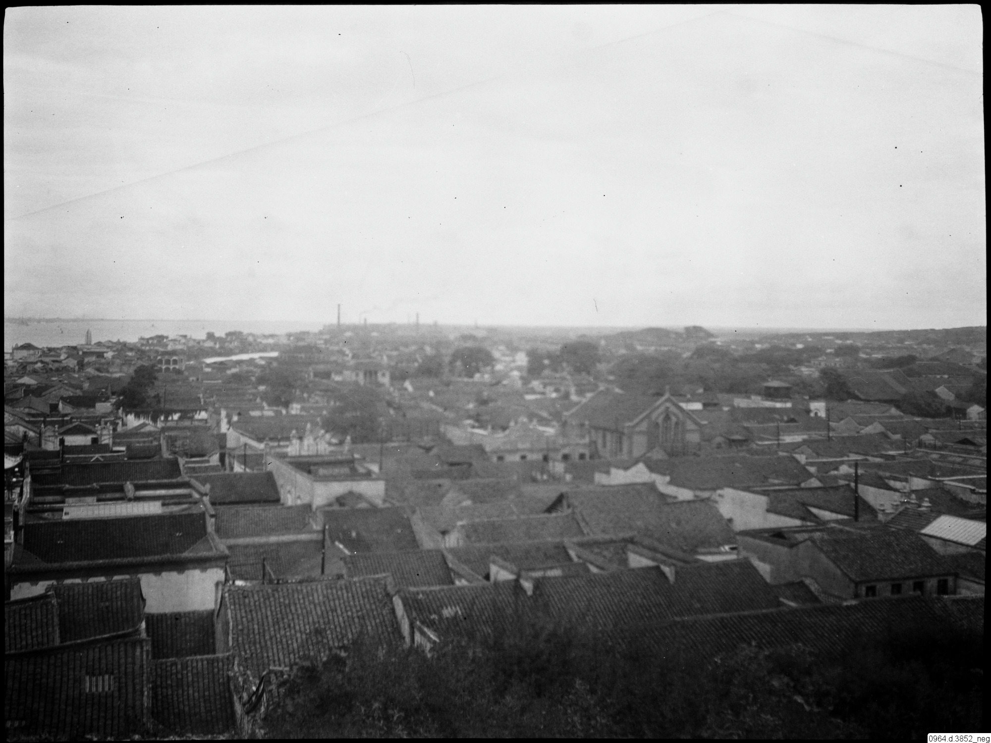 Stadsvy med hustak, kyrka och vatten/flod.