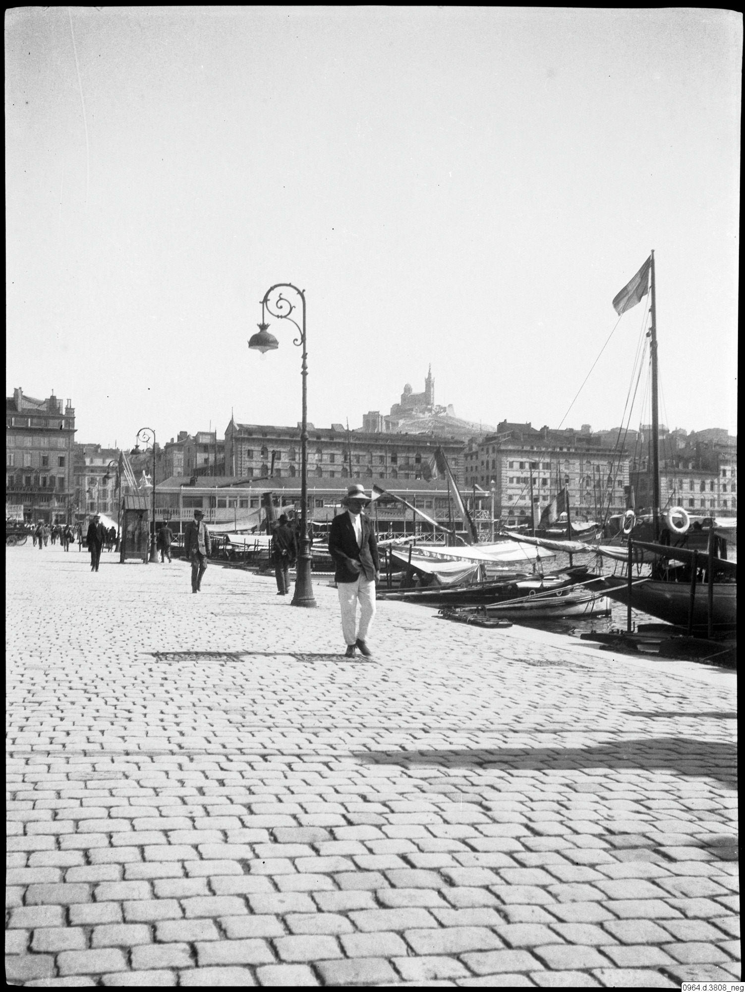 Quai des Belges vid Gamla hamnen (Vieux-Port) i Marseille. Notre-Dame de la Garde-basilikan i bakgrunden.