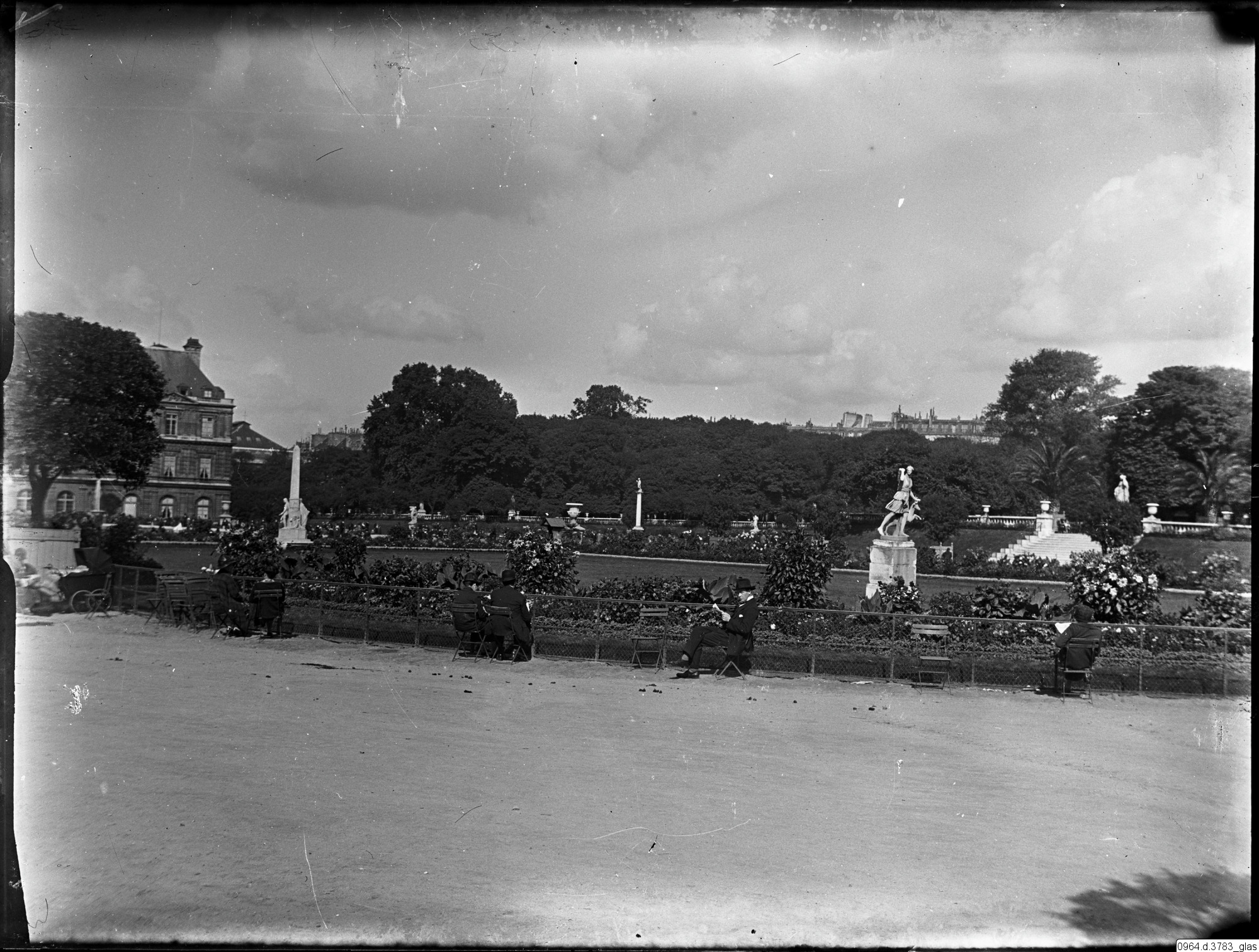 Personer sittandes på stolar, Luxembourg trädgården i Paris.