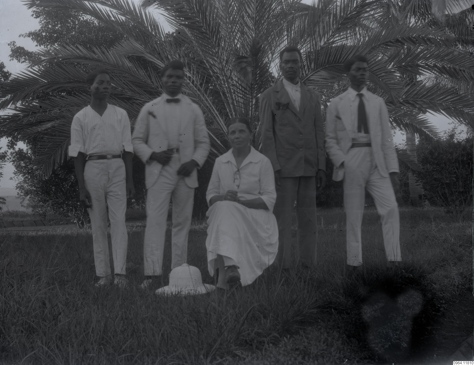 Fem personer, fyra män står i kostym, en kvinnlig missionär sitter.