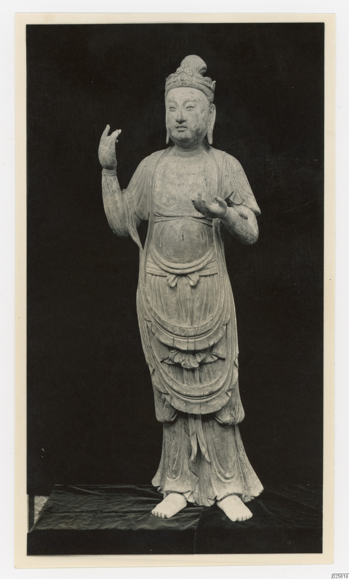 snidat trä. Stående bodhisattva. Snidat trä med spår av röda, blå och gröna pigment. Lockar inramar pannan, håret i toppknut, diadem. Väldefinierade drag, öppna ögon. Hängande örsnibbar, köttig hals med två veck. Händerna bildar mudrar, höger gest uppåt från armbågen, vänster sträcker sig framåt. Bröstet bart med sjal över axlarna. Dräkter på underkroppen till knäna och bara fötter. Band i midjan och nedanför höfterna.