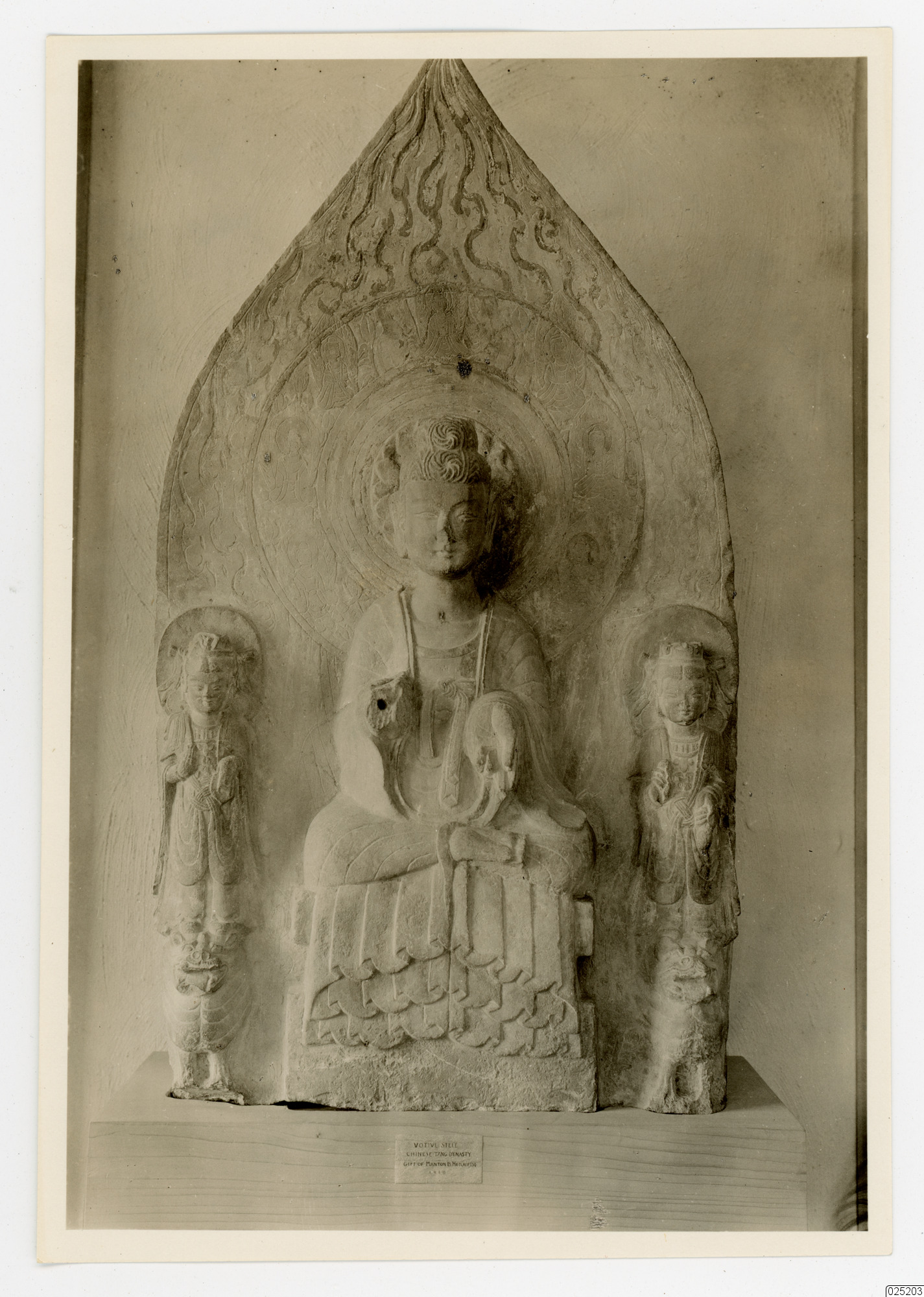 Sittande staty med en lövformad gloria och så finns det två mindre personer på vardera sida