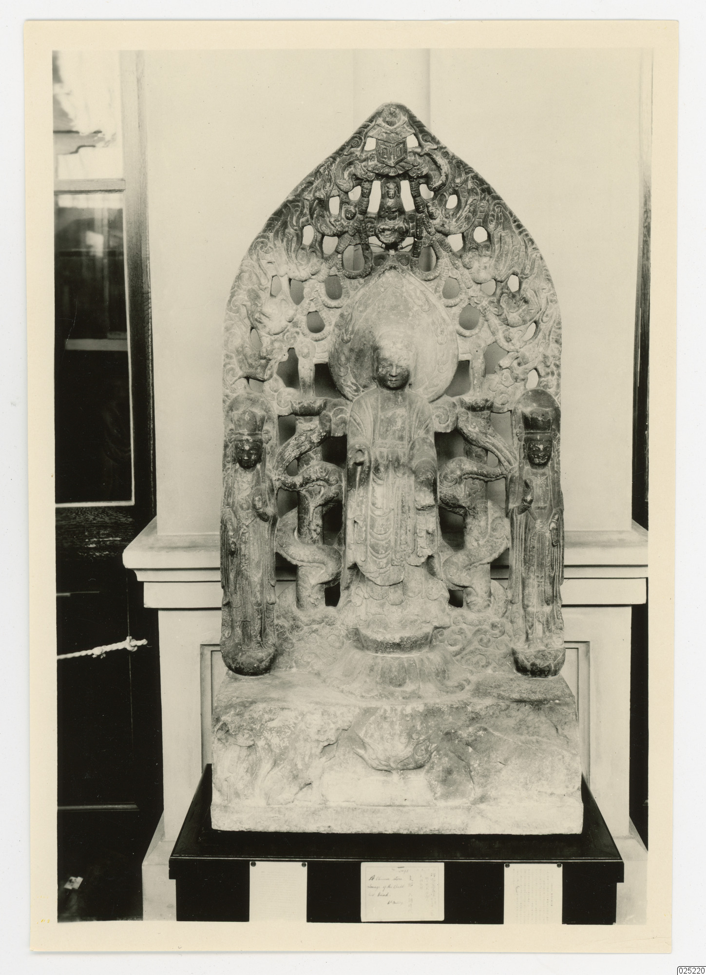 Skulptur med en staty i mitten med en liten lövformad gloria och omkring är två pelare som är omvirade av drakar och till siden av dem finns det två till statyer.
