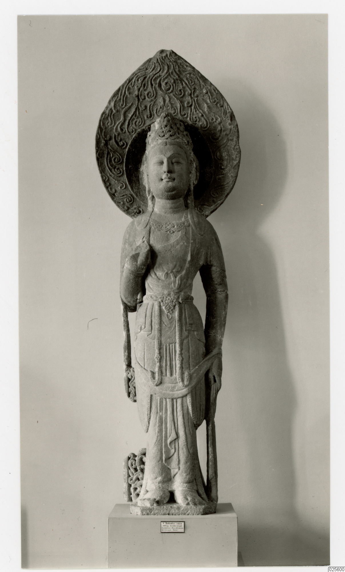 Bodhisattva i stående ställning. Sandsten med spår av polykromi.