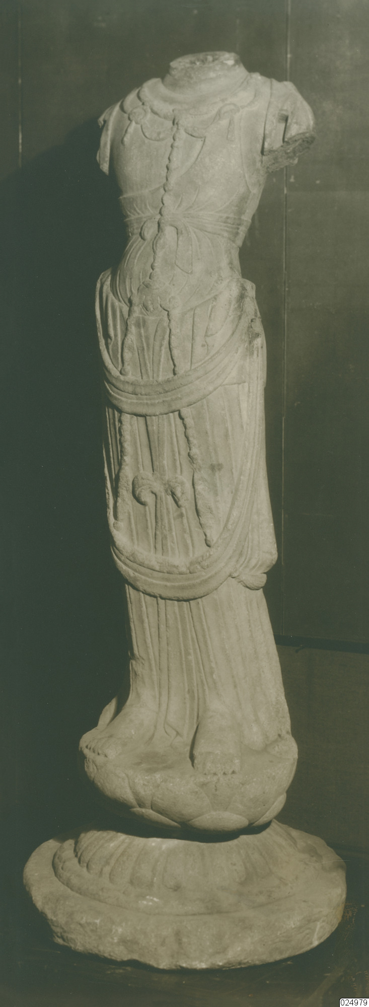 Staty i marmor föreställande en bodhisattva som saknar huvud och armar. Från Hebeiprovinsen. Tangdynastin.