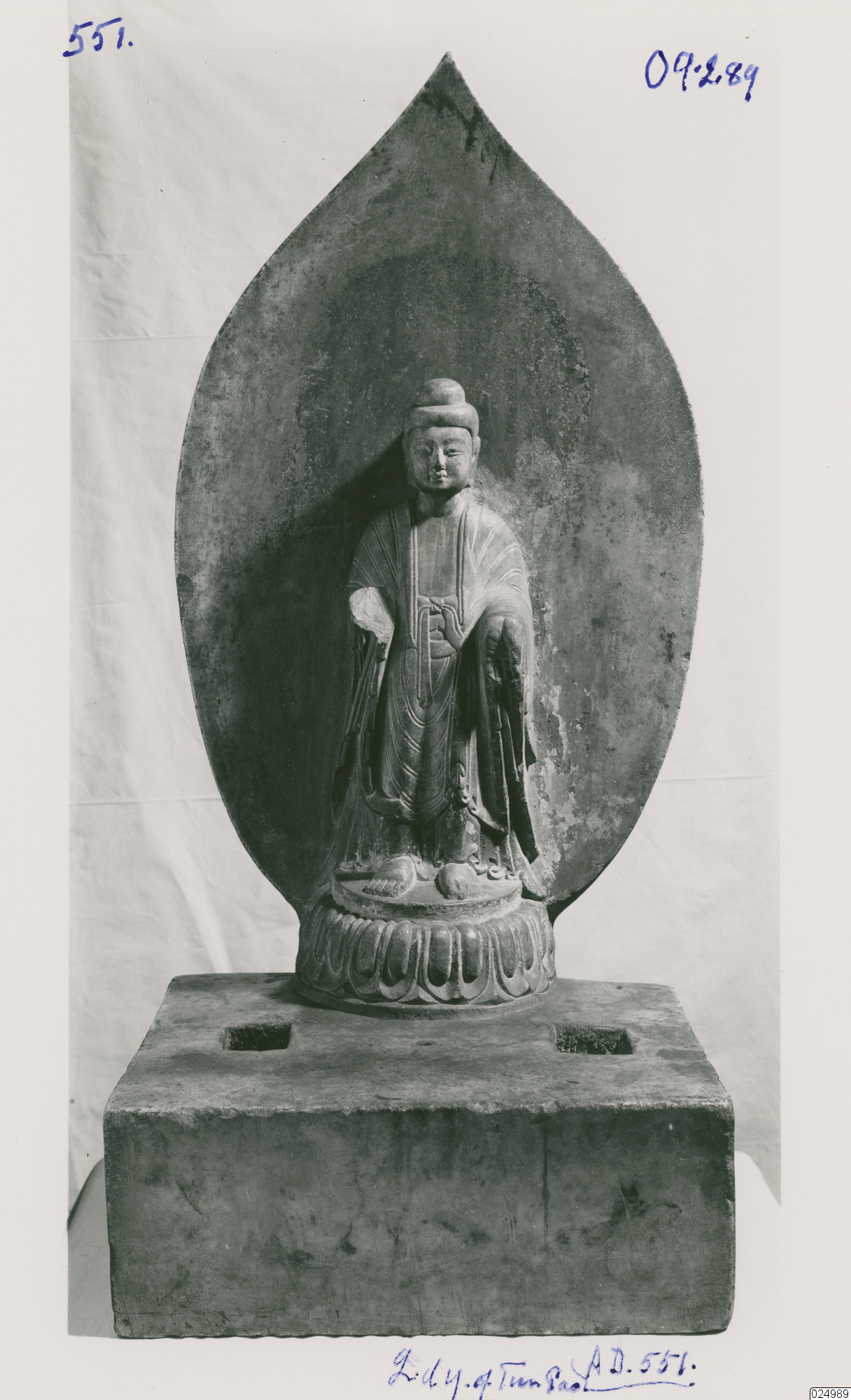 Buddhistisk staty gjord utav sten föreställande en stående figur som saknar höger hand.