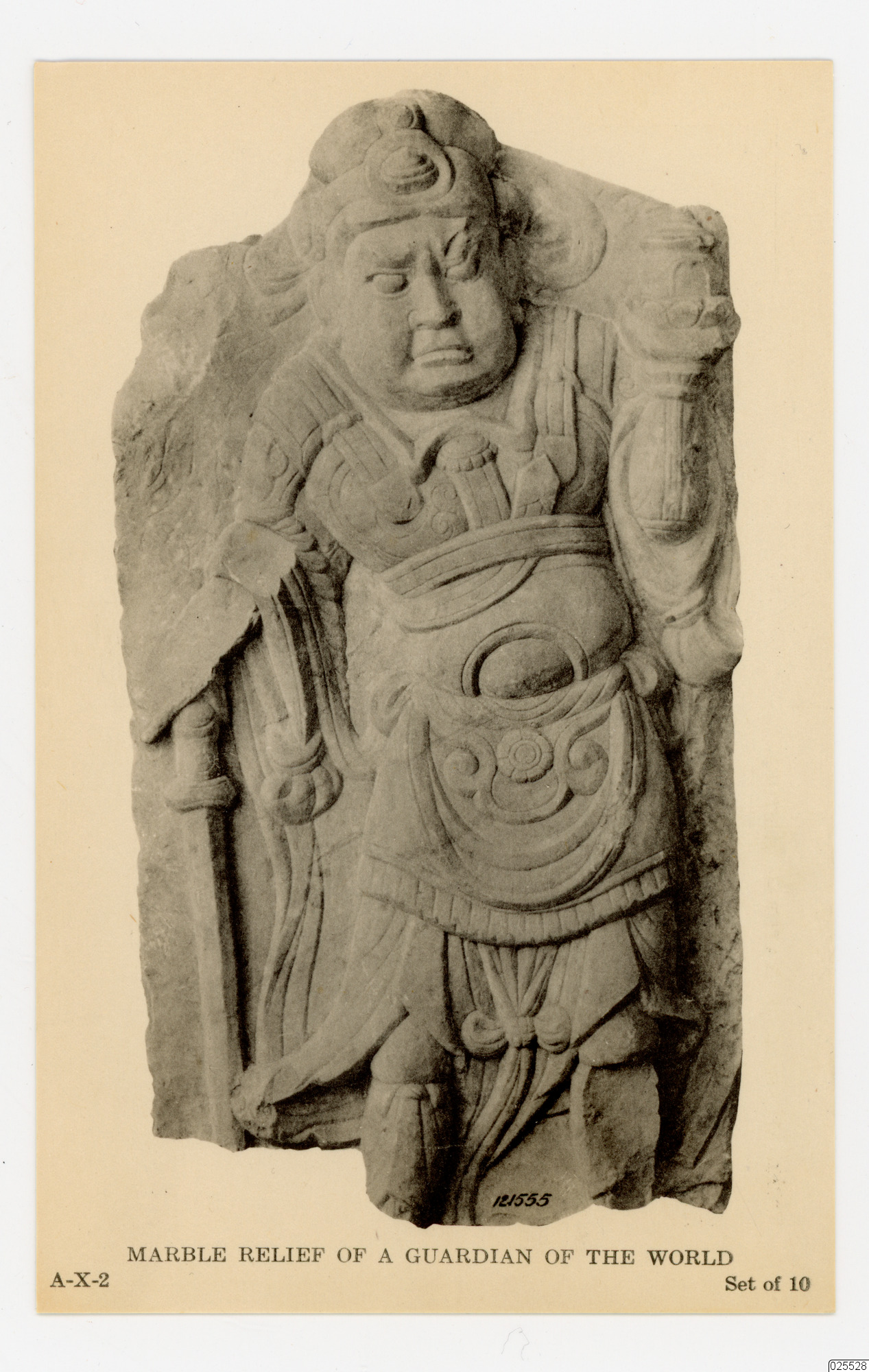 Marmorrelief av en världens väktare. En av de så kallade fyra stora kungarna som härskar vid foten av världsberget Sumeru. Detta är kung Virupaksha stationerad på bergets västra sida, med ett svärd i sin högra hand och en miniatyrpagod i sin vänstra hand. Kina, T'ang-perioden (618-906 e.Kr.)