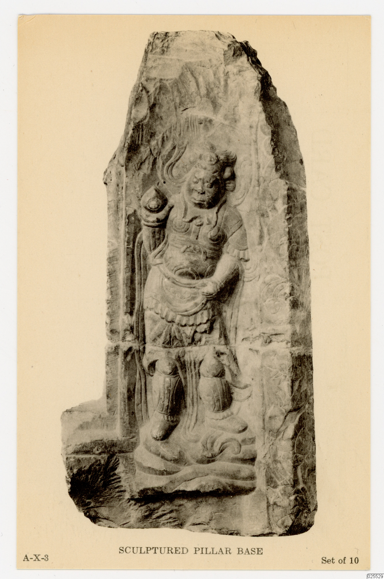 Skulpterad pelarbas. En av världens väktare är avbildad i hög relief, klädd i en komplett rustning och håller en juvel i sin högra handflata. Juvelen är en symbol för den buddhistiska religionen.