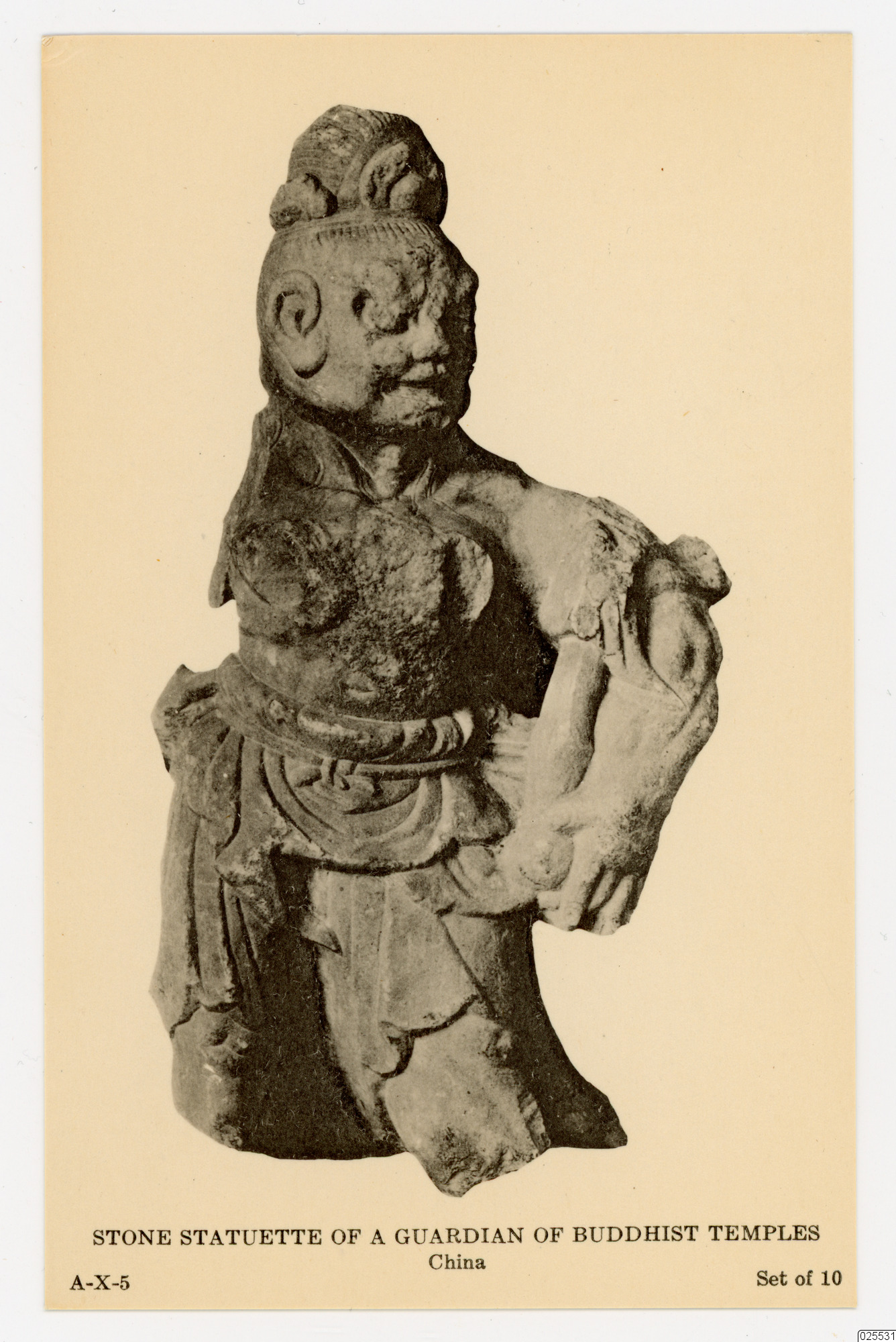 Stenstatyett föreställande en väktare av buddhistiska tempel. Han håller en krigsklubba i sin vänstra hand och vaktar ingången till buddhistiska tempel från attacker av demoner och andra fientliga inkräktare. Kina, T'ang-perioden (618-906 e.Kr.)