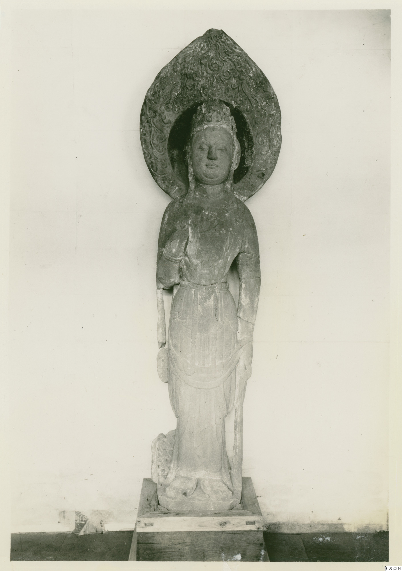 Skulptur/figur i brungrå sandsten. Föreställer en stående Bodhisattva. Östra Wei-dynastin.
