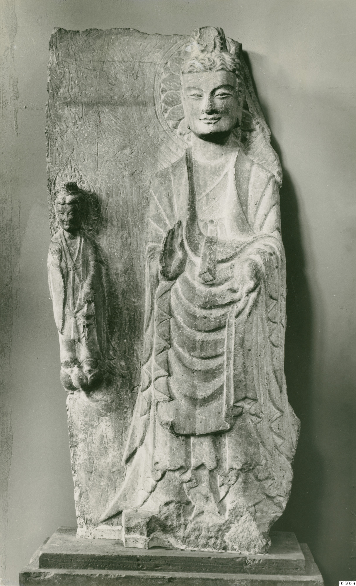 Buddhistisk votivstele skulptur/staty gjord utav grå kalksten. Norra Wei-dynastin.