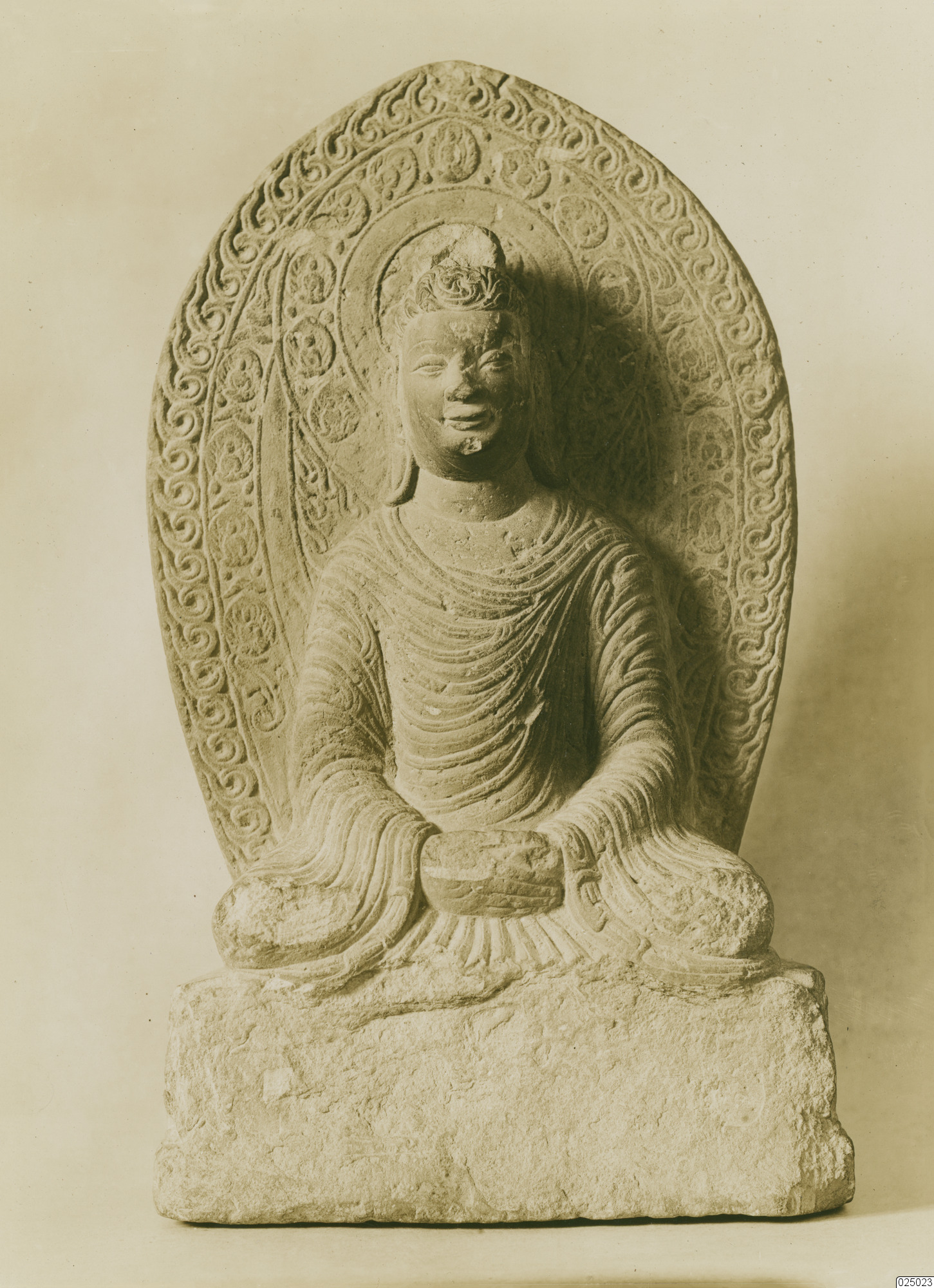 Staty i kalksten föreställande en sittande Buddha. Norra Wei-dynastin.