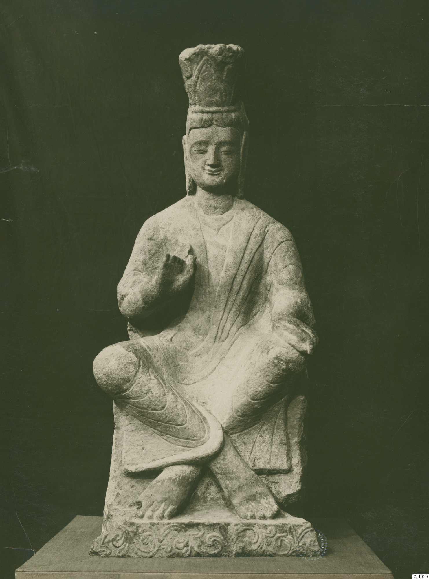 Sittande bodhisattva med benen i kors. Statyn kommer från en av Yunganggrottorna.