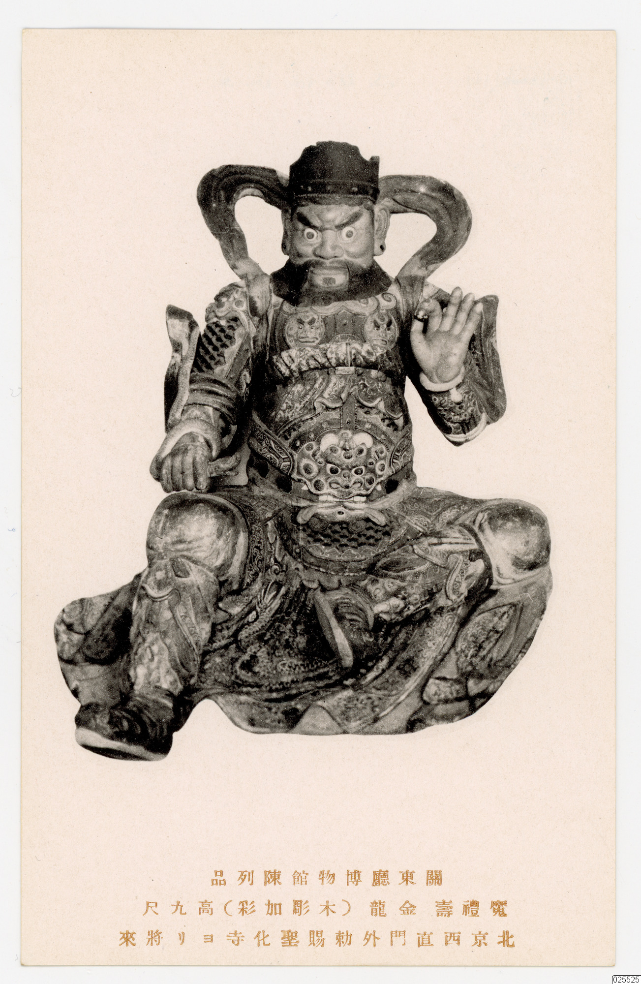 Den västerländska himmelske kungen Guangmu. Den västerländska himmelska kungen av vida ögon, ledaren (underordnad), heter Virupaksha, iklädd rustning, med en orm (röd drake) virad runt sin högra hand och ett piller i sin vänstra hand. Vida ögon betyder att han kan använda sina himmelska ögon för att observera världen när som helst och skydda alla levande varelser. Han har en orm (röd drake) virad runt sin hand, och han använder ett ormrep för att fånga dem som respektlöst visar buddhismen och föra dem tillbaka till buddhismen.