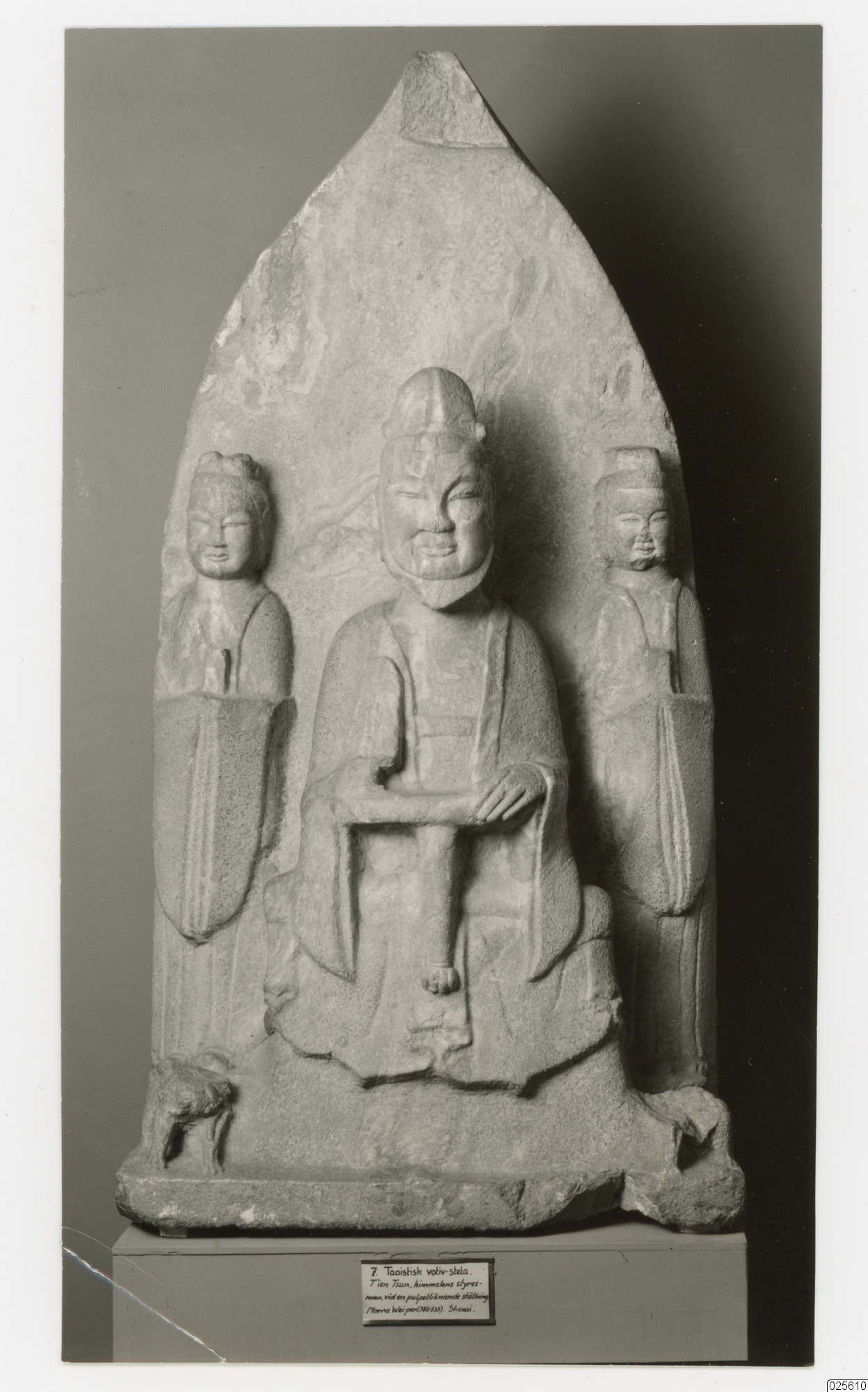 Daoistisk offerskulptur föreställande Laozi, enligt traditionen den filosofiska daoismens grundare och författare till Daodejing (Boken om vägen). På varje sida om Laozi står en mindre figur i fotsida dräkt. Vid deras fötter syns väktarlejon, delvis förstörda. På skulpturens baksida finns en inskription från Yuan-dynastin, 1279-1368. Gulvit kalksten. Från området kring Xian i provinsen Shaanix.