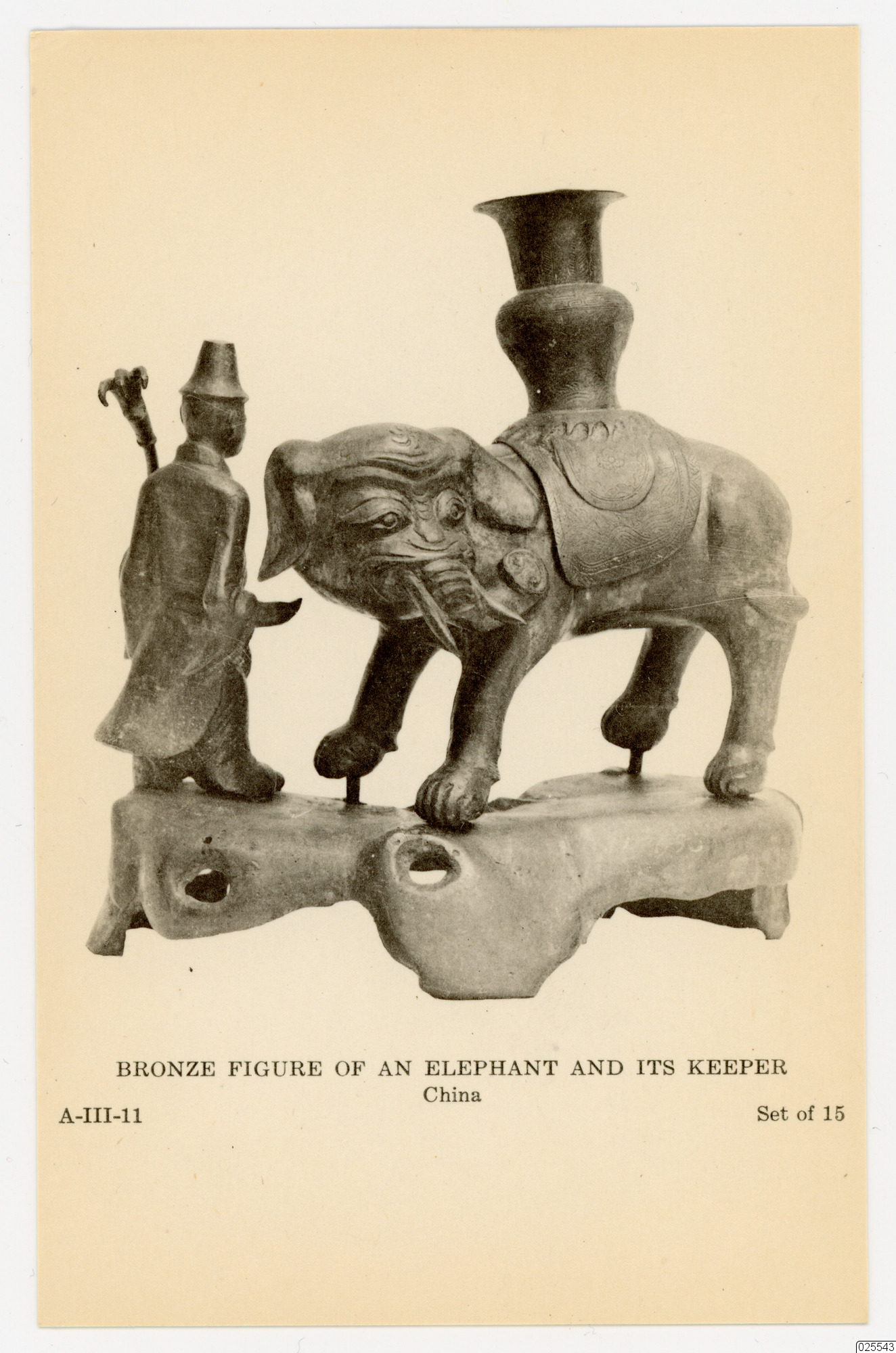 elefant och dess skötare. Djuret bär på ryggen en vas som ska innehålla gåvor avsedda som tribut till kejsaren. Dess vårdare är en man från Indien eller Centralasien. Chin, Sung-perioden (960-1269 e.Kr.).