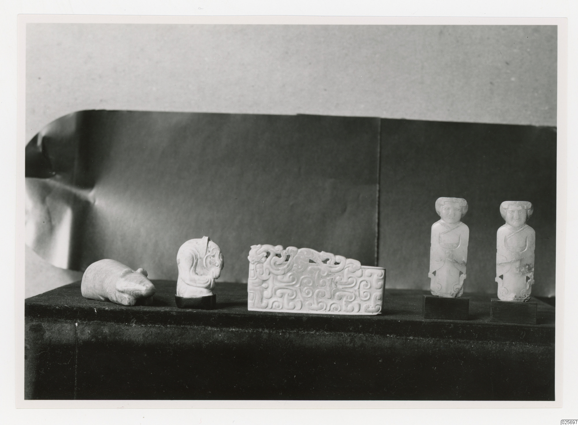 Fem olika jadeföremål: Två djur, ett Jadesvärdhänge i mitten, och två mänskliga figurer möjligtvis två munkar