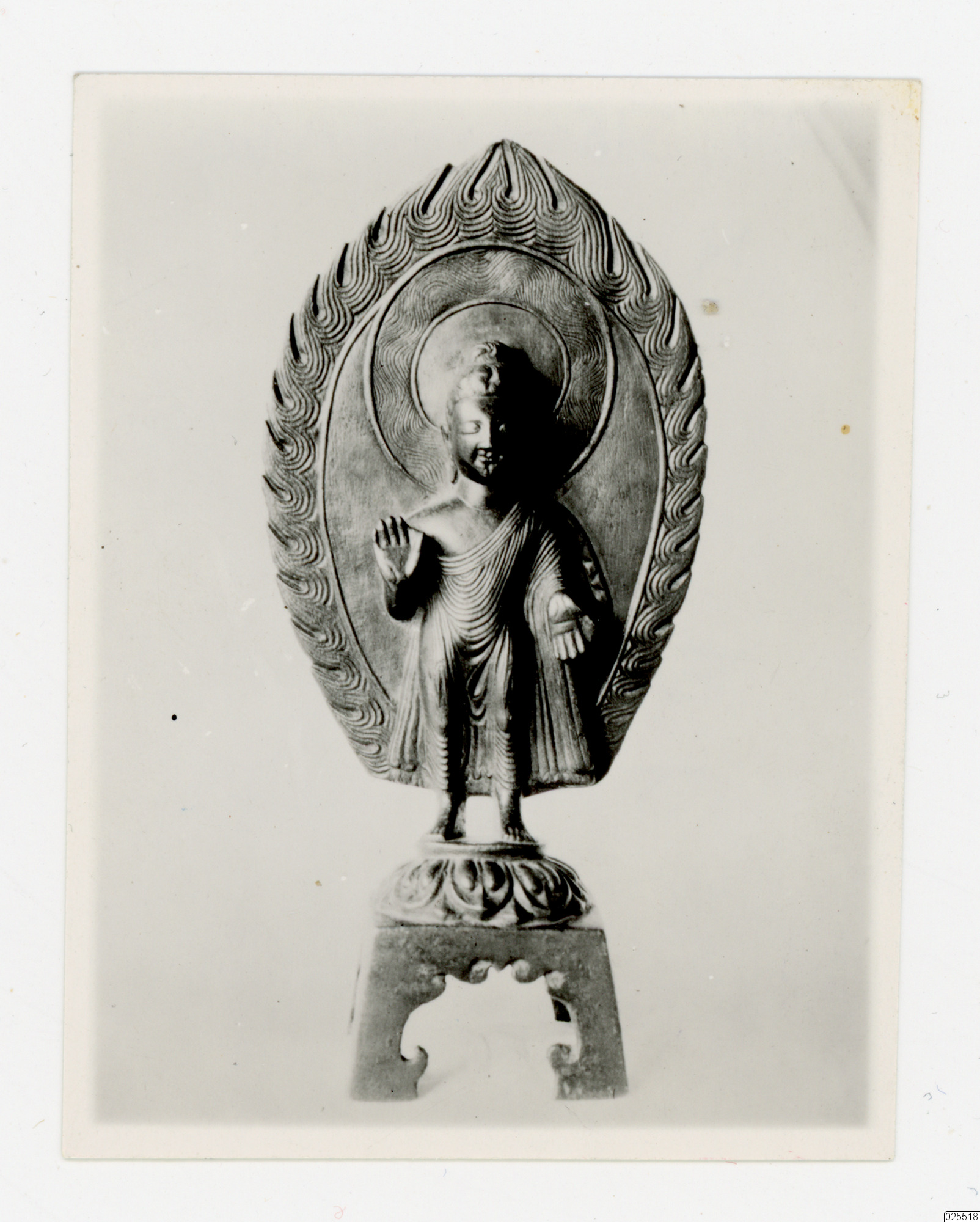 Stående budhha på en fyrbent piedestal, troligtvis i guld