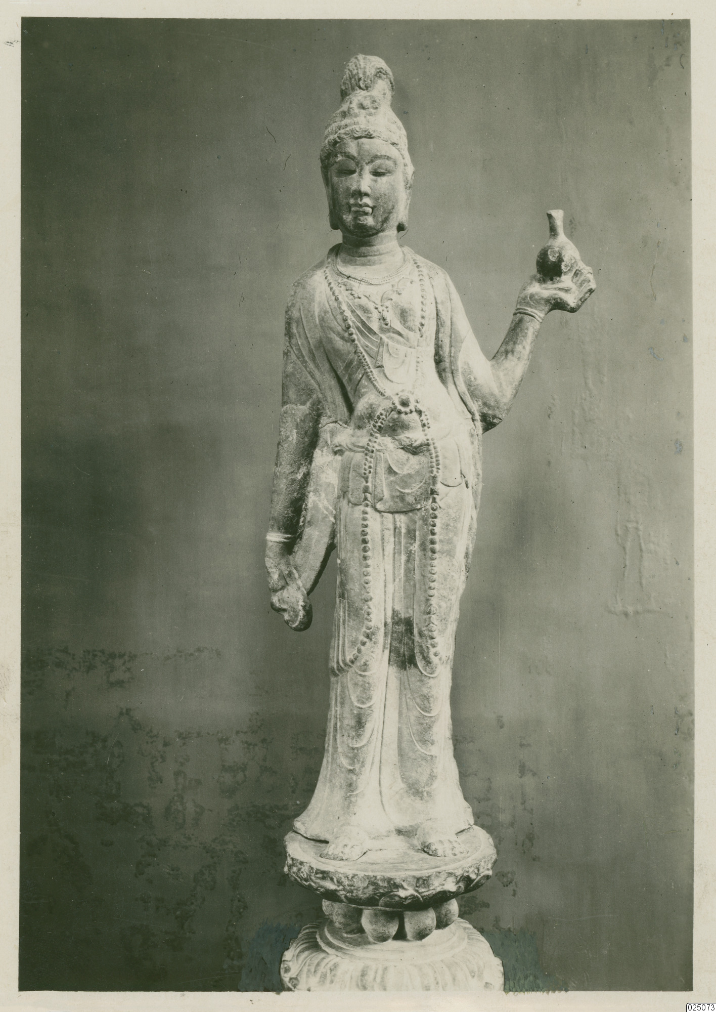 Staty/skulptur i grå kalksten föreställande en bodhisattva. Hittades i Longmengrottorna.