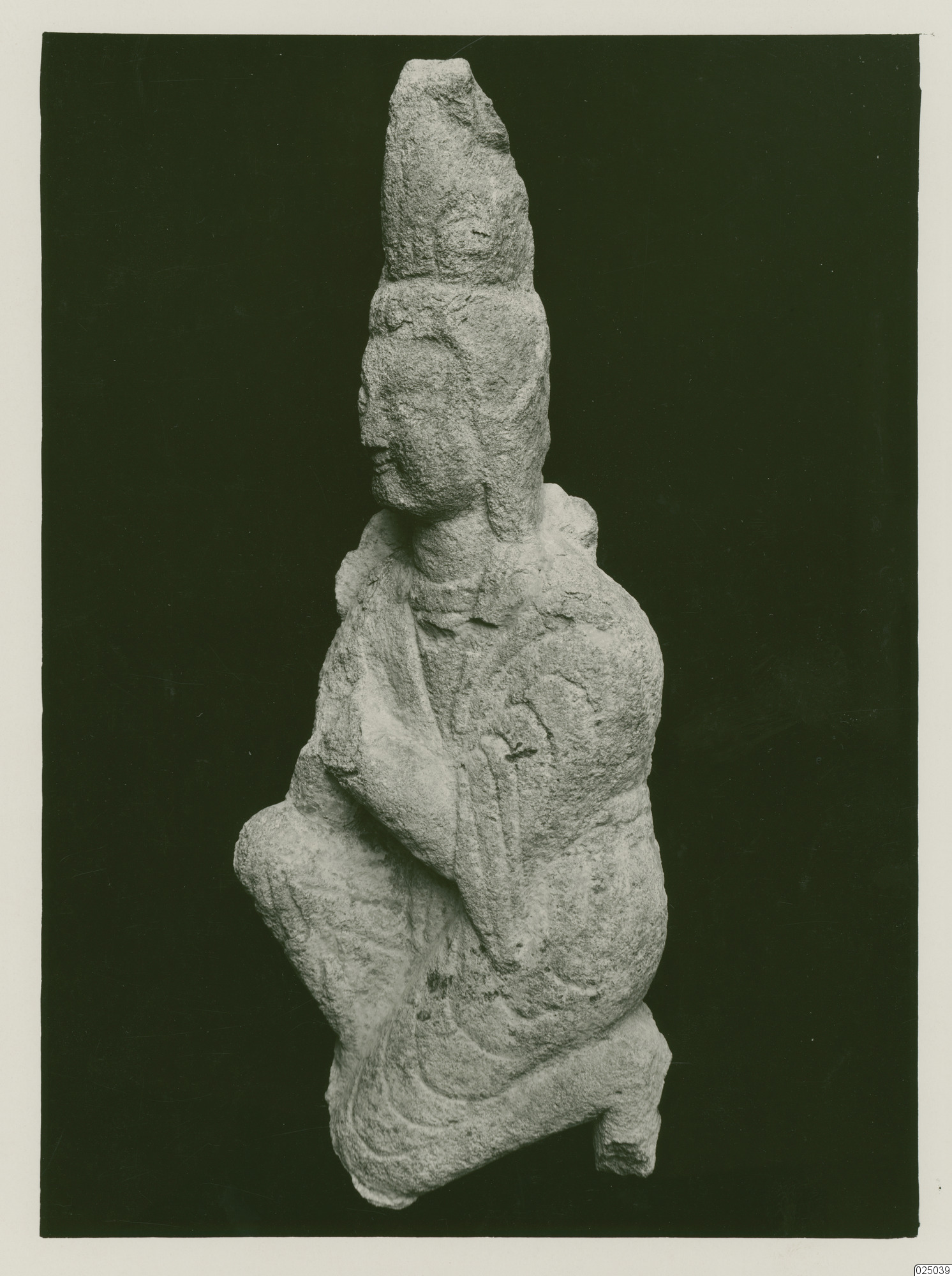 Figur gjord utav sandsten föreställande en bodhisattva på knä som ber. Norra Wei-dynastin.