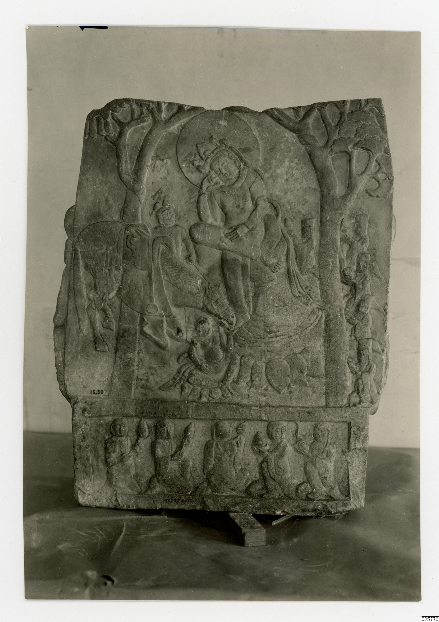 Baksidan av en staty som avbildar Bodhisattva och skötare.