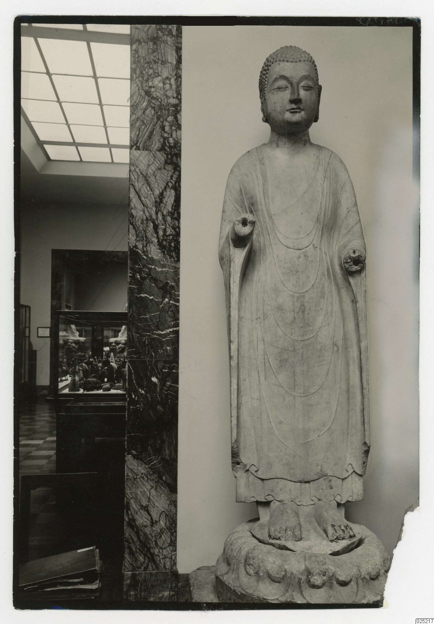 Stående Buddha Sakyamuni staty med båda händerna förstörda