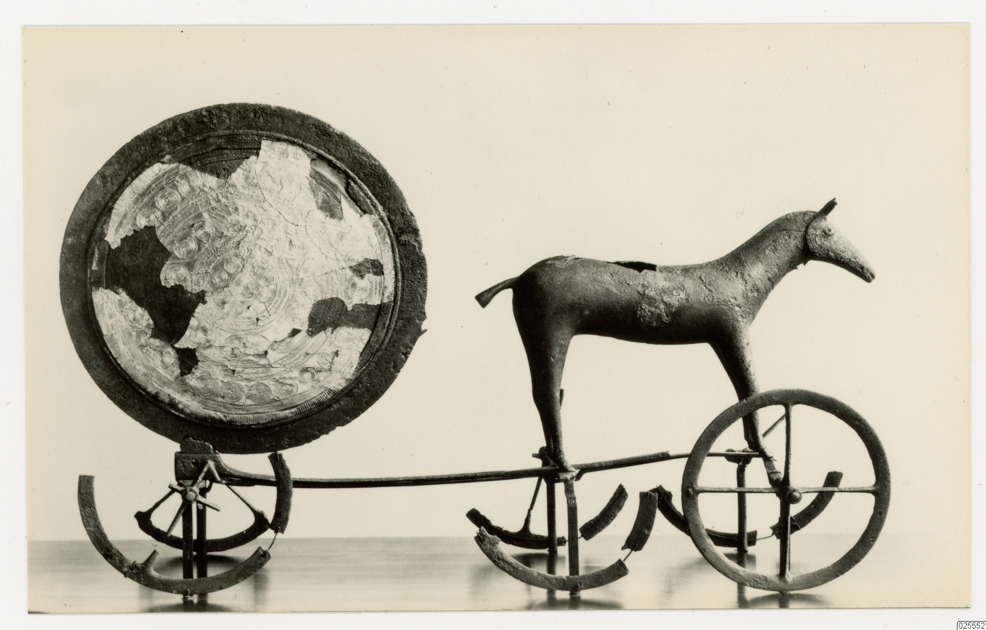 Solvagnen/solbilden från Trundholm Mose. Material: brons och guld. Fynd av deposition/votivljus, tidig bronsålder, ca 1000 f. Kr.