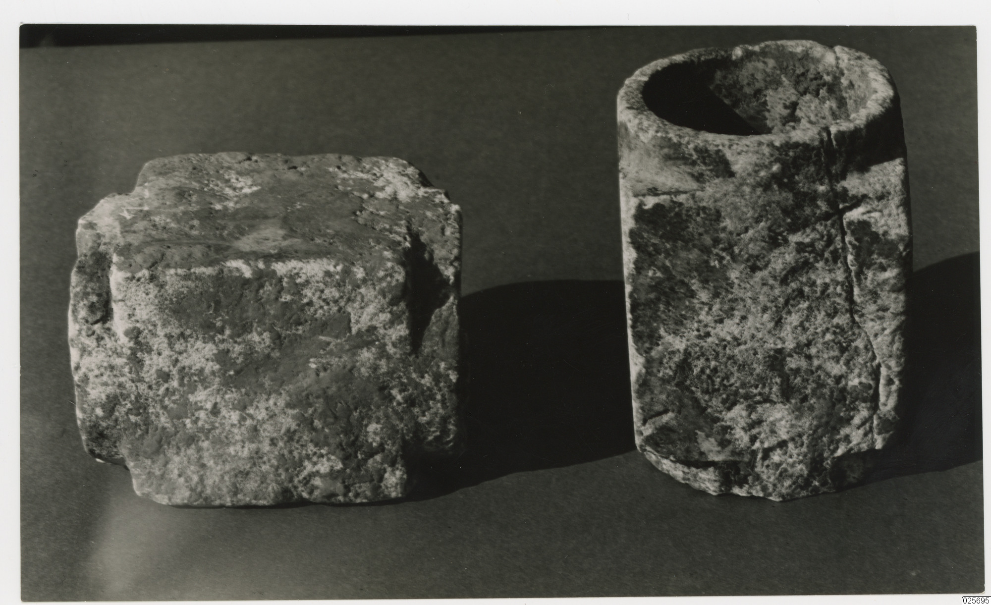Två stenföremål. Till vänster en slags fyrkantig sten med utstickande sidor. Till höger: ett kinesiskt rör.
