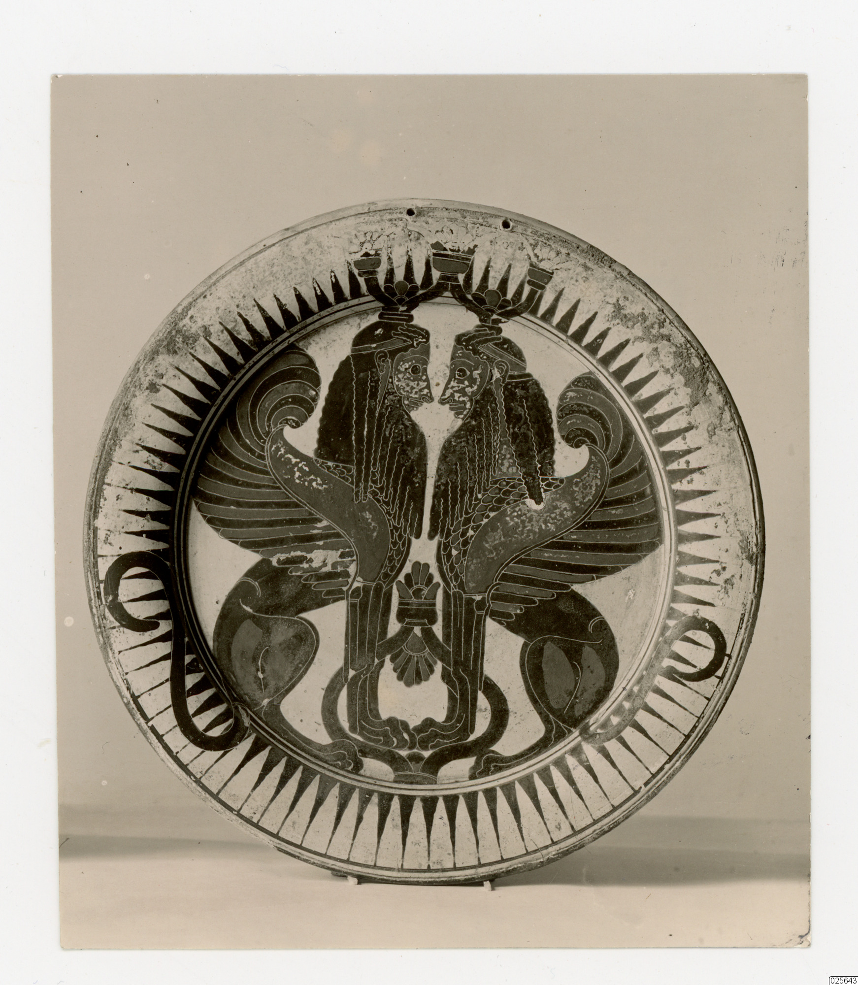 Tallrik dekorerad med två mytiska sfinxer, en varelse med människoansikte, lejonkropp och vingar. Daterad 600 f.Kr.