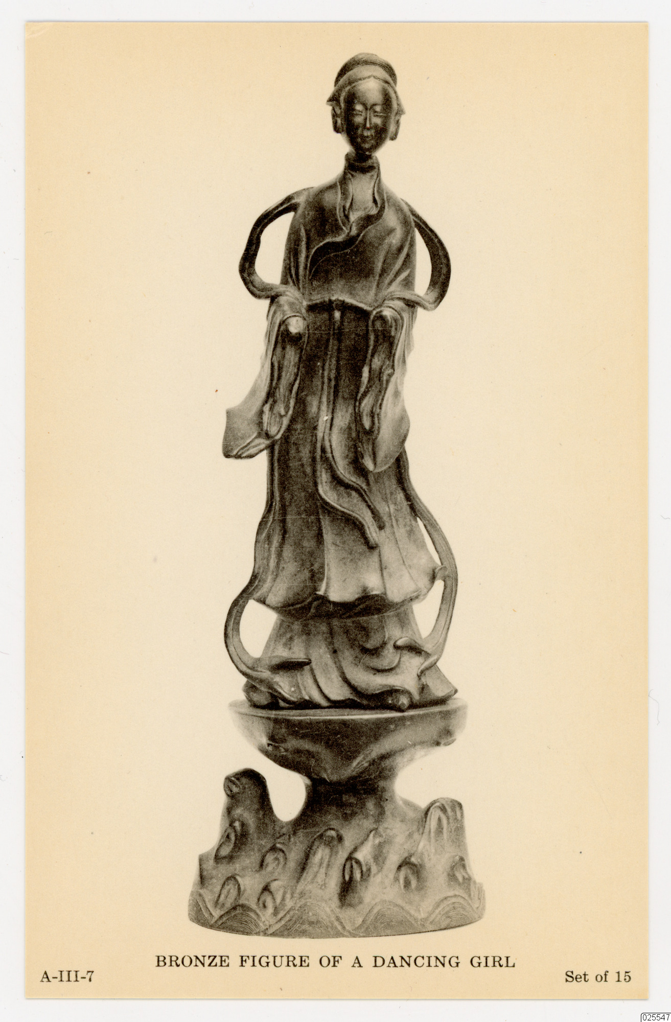 Bronsfigur föreställande en dansande flicka. En från en uppsättning om tio som föreställer tio berömda skönheter från Han-perioden. Bronsbasen föreställer klippor omgivna av vågor. Kina, Ming-perioden (1368-1643 e.Kr.)