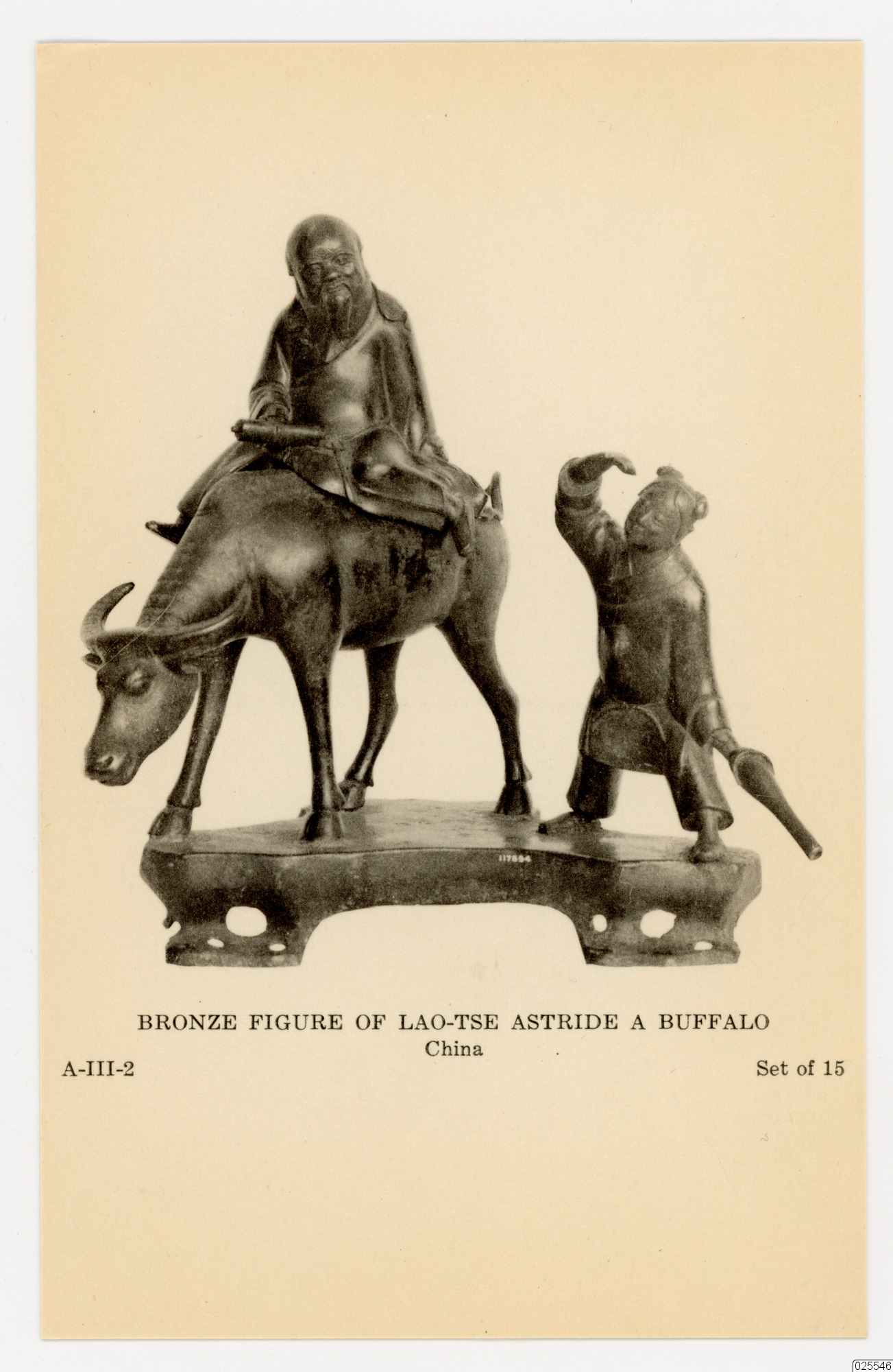 Bronsfigur föreställande Lao-tse grensle över en buffel. Den berömde filosofen Lao-tse, grundare av den taoistiska religionen, håller en skriftrulle på vilken hans berömda avhandling, Tao Te-kungen, är skriven. En yngling följer buffeln. Kina, Mingperioden (1368-1643 e.Kr.)
