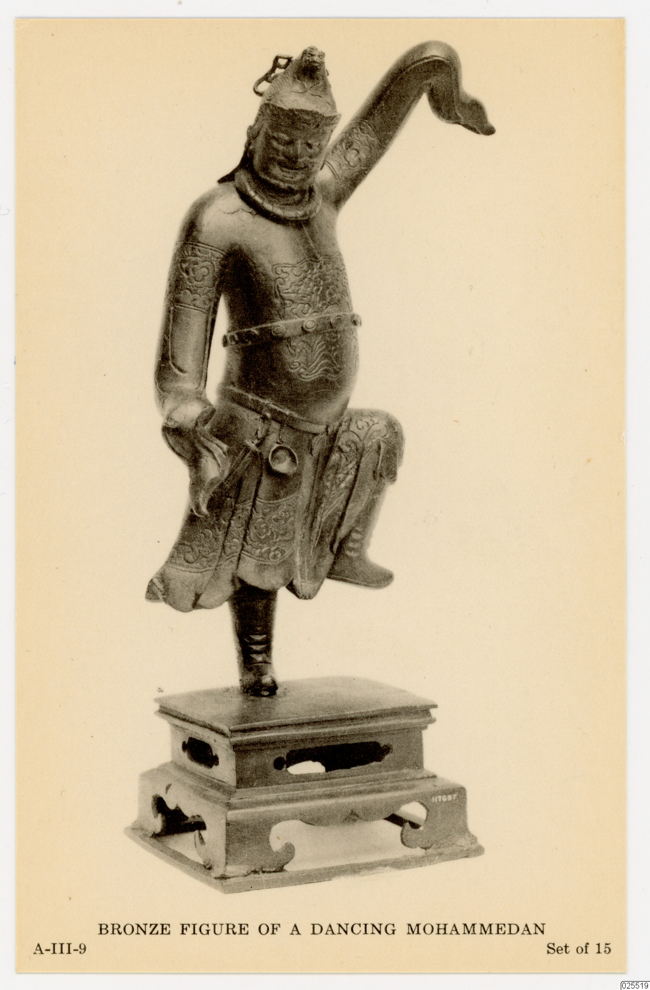 Bronsfigur av en dansande muhammedan. De långa fladdrande ärmarna är det konstnärliga sättet att representera en dans. Han bär en huva krönt av ett lejonhuvud; en dolk och en skål hänger i hans bälte. Kina, K'ien-lung-perioden (736-95 e.Kr.)