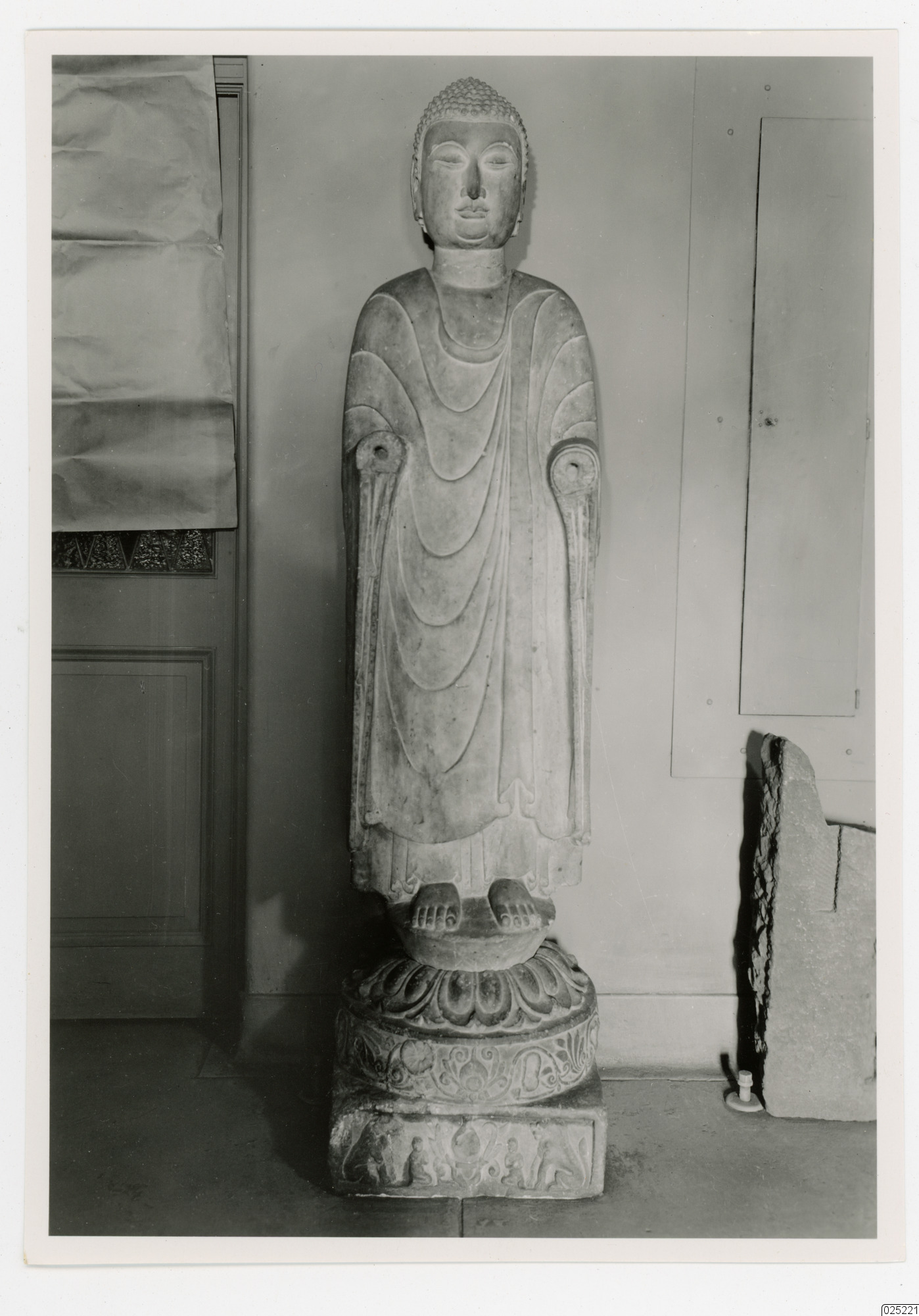 stående staty på en lotuspiedestal och båda händerna är förstörda.