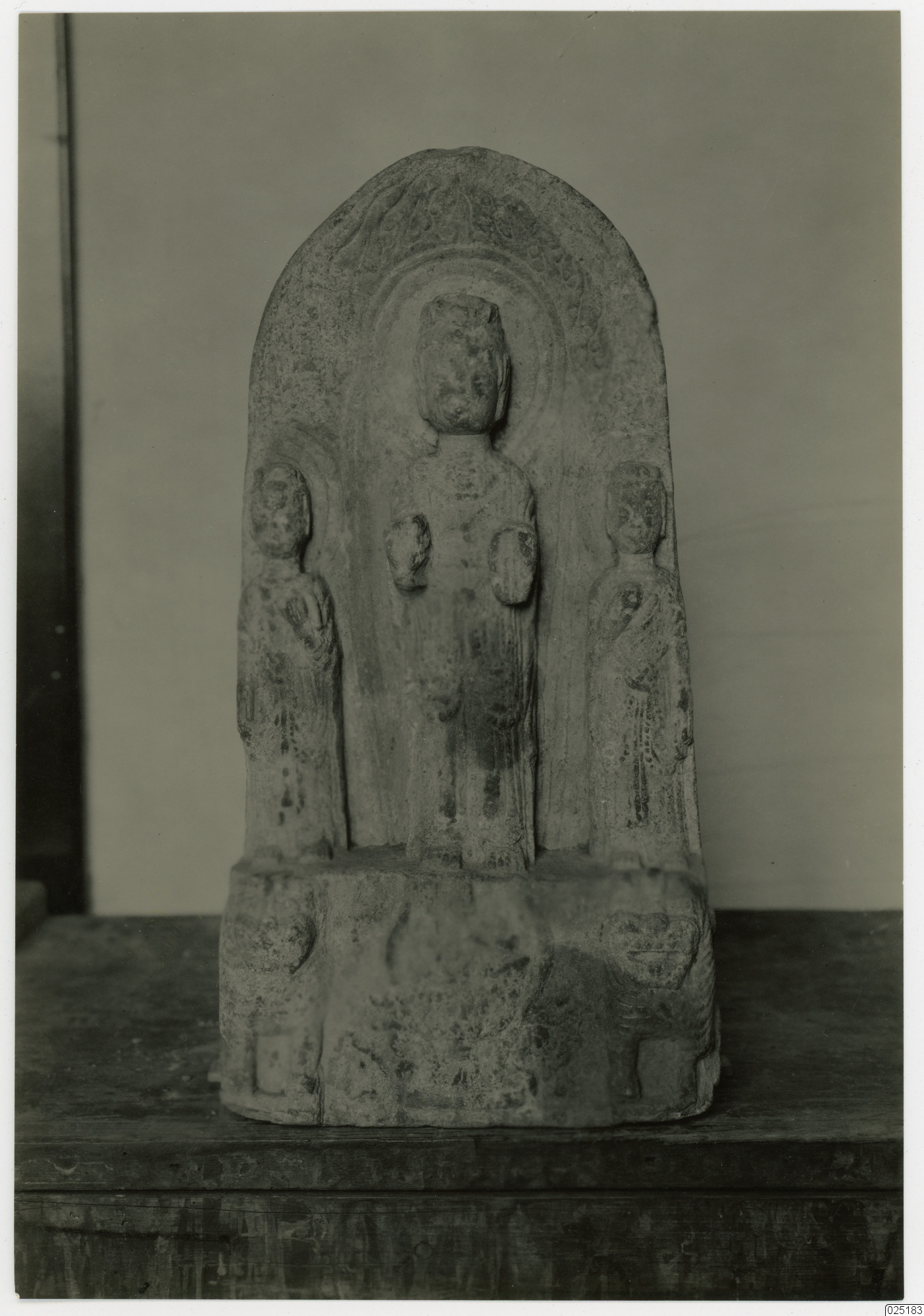 Tre ståendes Bodhisattvor, den största i mitten med båda händerna i Abhaya Mudra och Önskemålnngen. Framsidan av den höga piedestalen är dekorerad med ett rökelsekar och två lejon (554 e.Kr.)