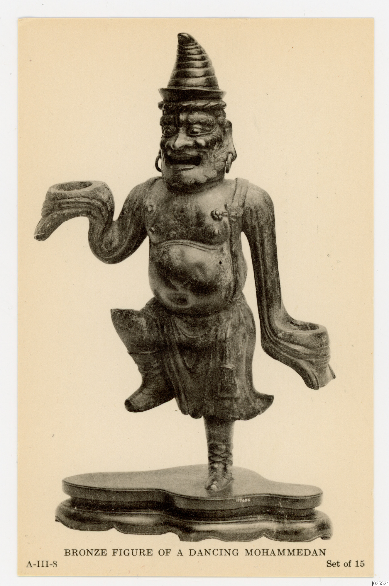 Bronsfigur föreställande en dansande muhammedan. Med turban och stora örhängen. De perforerade ändarna av ärmarna användes för insättning av ljusstakar.