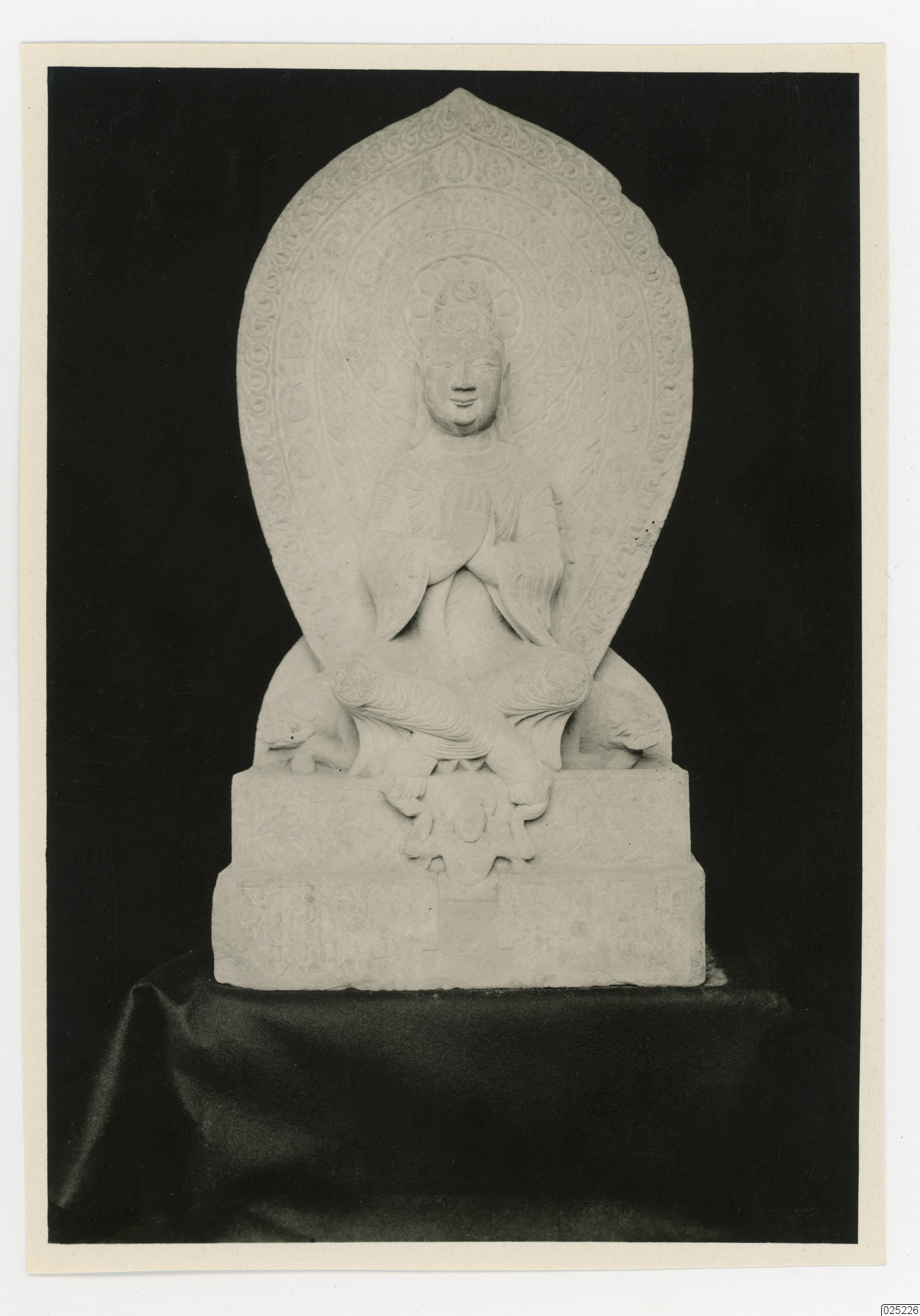 Sittande Staty med benen i kross och händerna ihop, med en lövformad gloria.