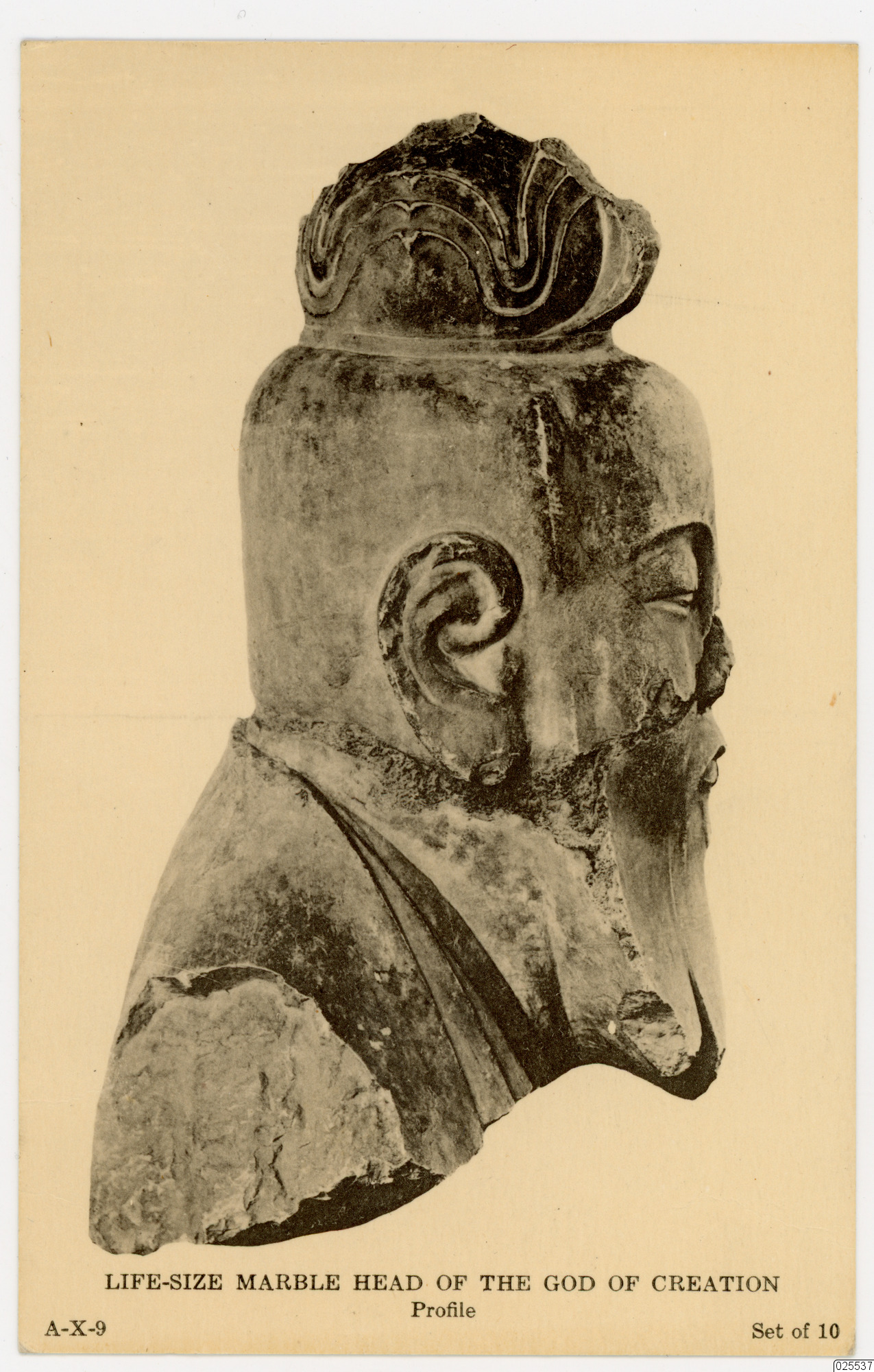 Marmorhuvud i naturlig storlek av skapelseguden. Yüan Shi T'ien Tsun, taoisternas högsta gud, kallad Himmelens Vördade. Han är personifieringen av alltings ursprung och skapelse. Kina, T'ang-perioden (618-906 e.Kr.)