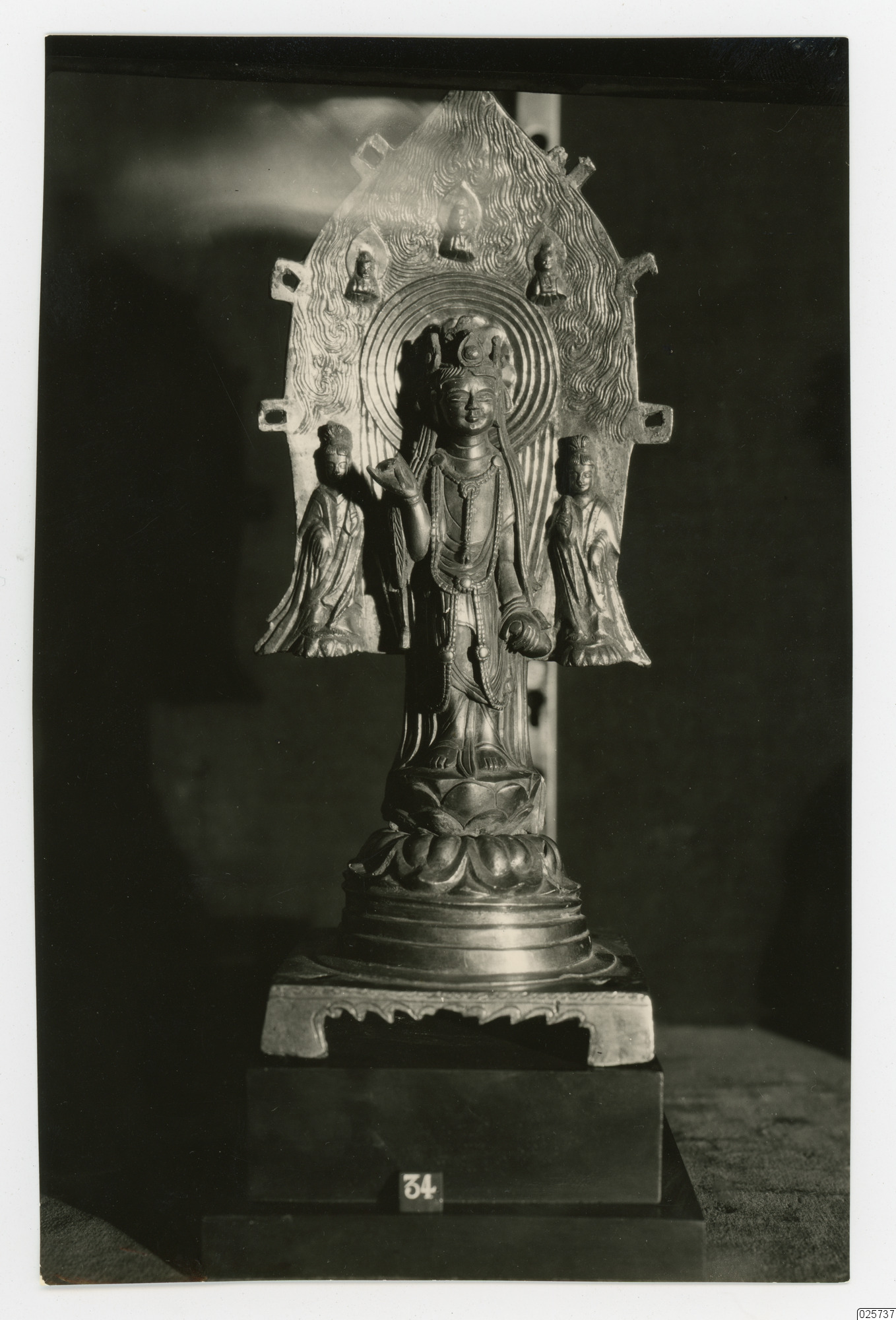 Stående staty på en lotuspiedestal med en lövformad gloria och det finns två skulpturer på mindre personer på båda sidorna.