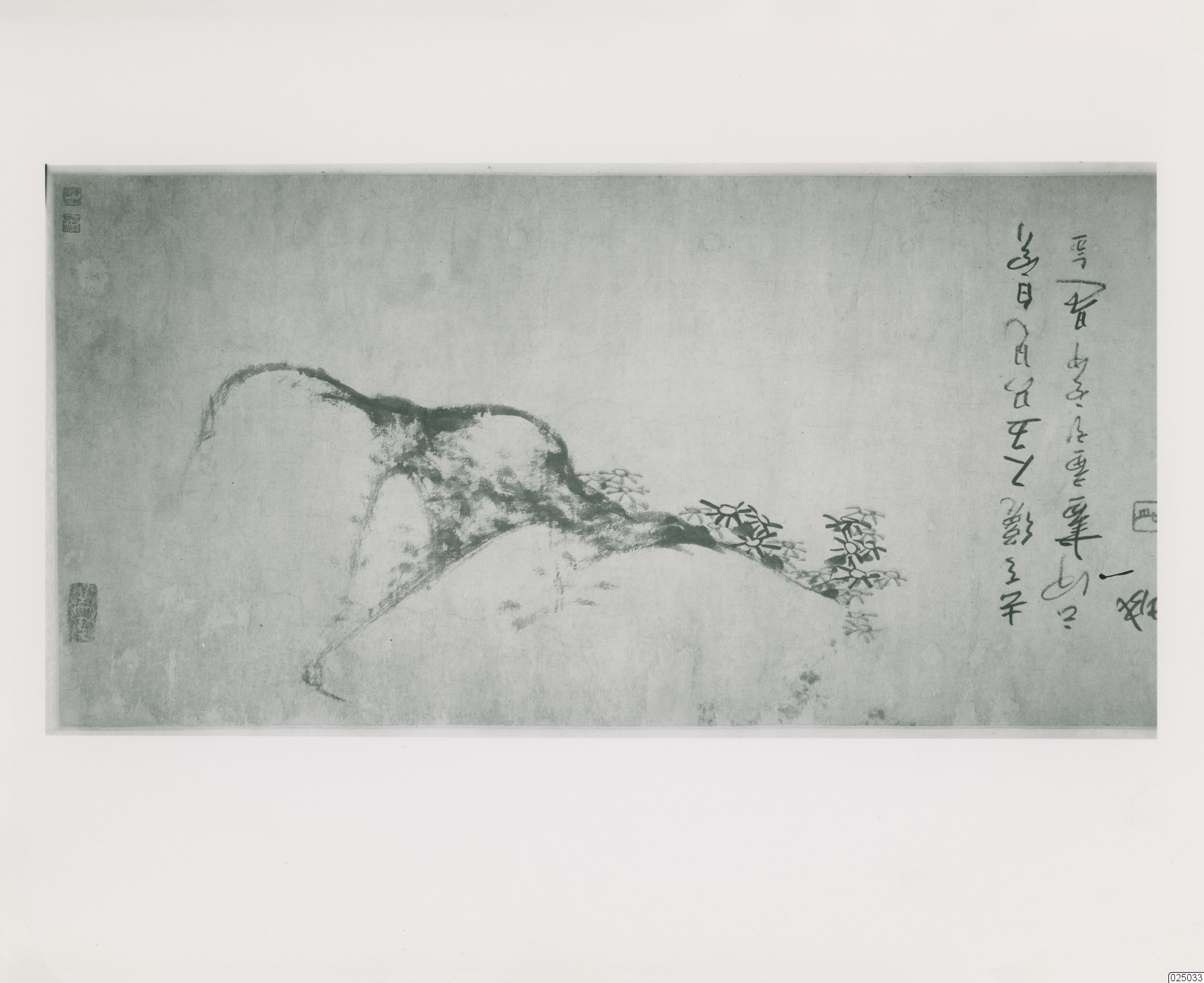 En "makimono", rullmålning/tavelrulle. Målning föreställande stenar. Qing-dynastin.