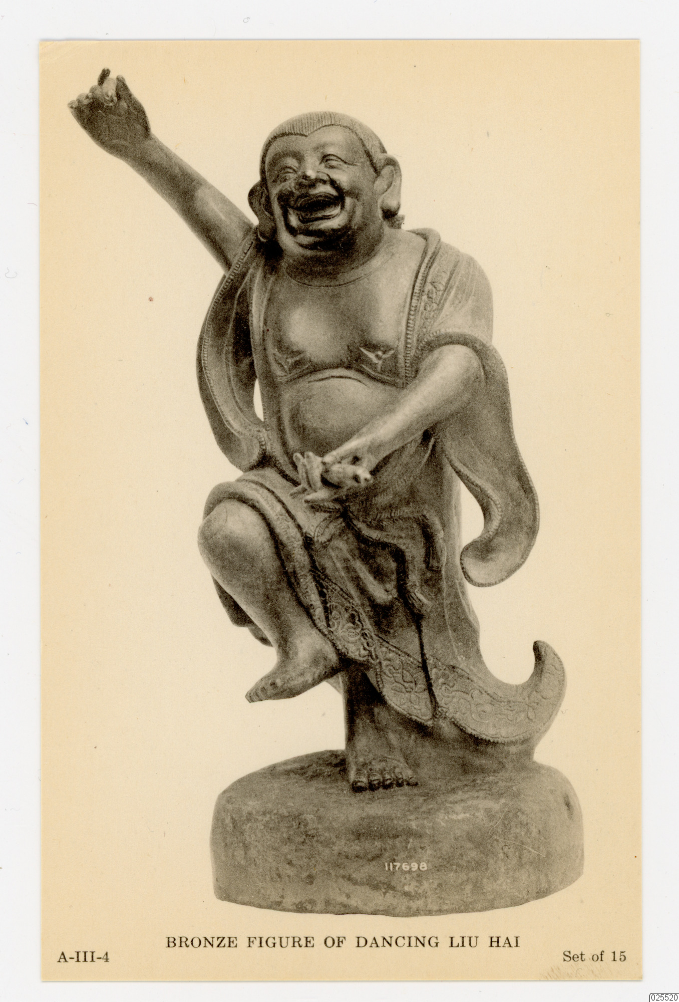 Bronsfigur föreställande den dansande Liu Hai. Han är typen av den gladlynte, lyckliga tiggaren som lever en eremitliv. Kina, Mingperioden (1368-1643 e.Kr.)