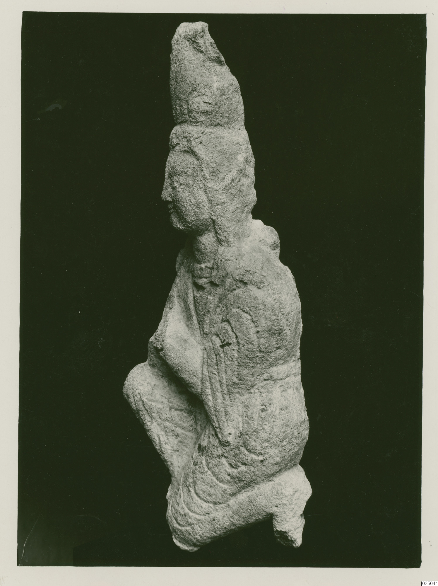 Figur gjord utav sandsten föreställande en bodhisattva på knä som ber. Norra Wei-dynastin.