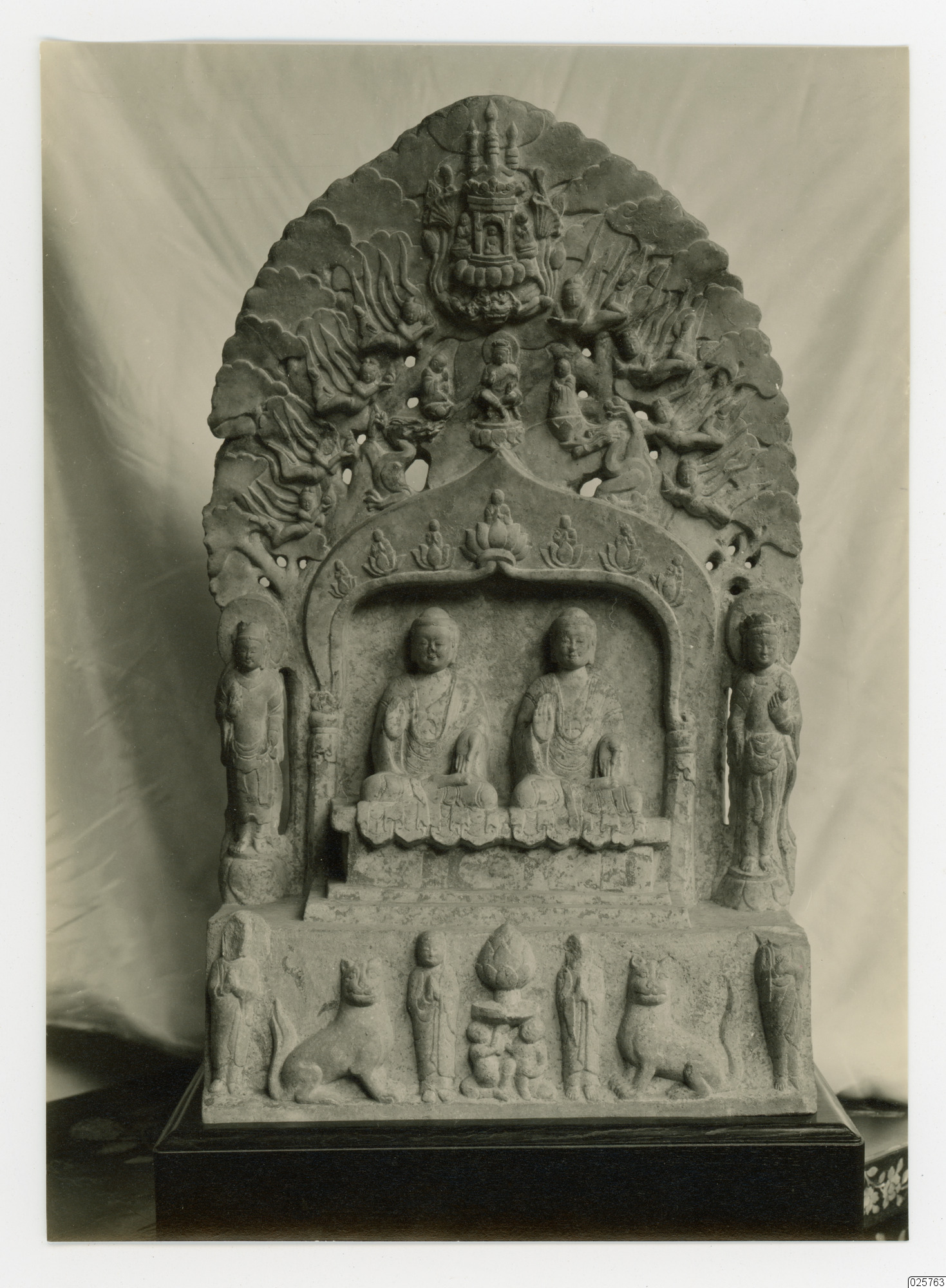 Skulptur med två statyer som sitter med benen i kors och på sidan av de så finns det en person på vardera sida och under de så finns det 6 personer och 2 sittande lejon och över det så finns det 7 personer som ber i lotusblommor och över de så finns det 11 personer i himelen och två drakar, och överst så finns det ett tempel i himmelen med 3 personer i.